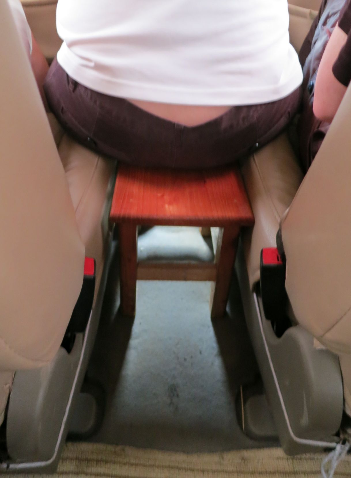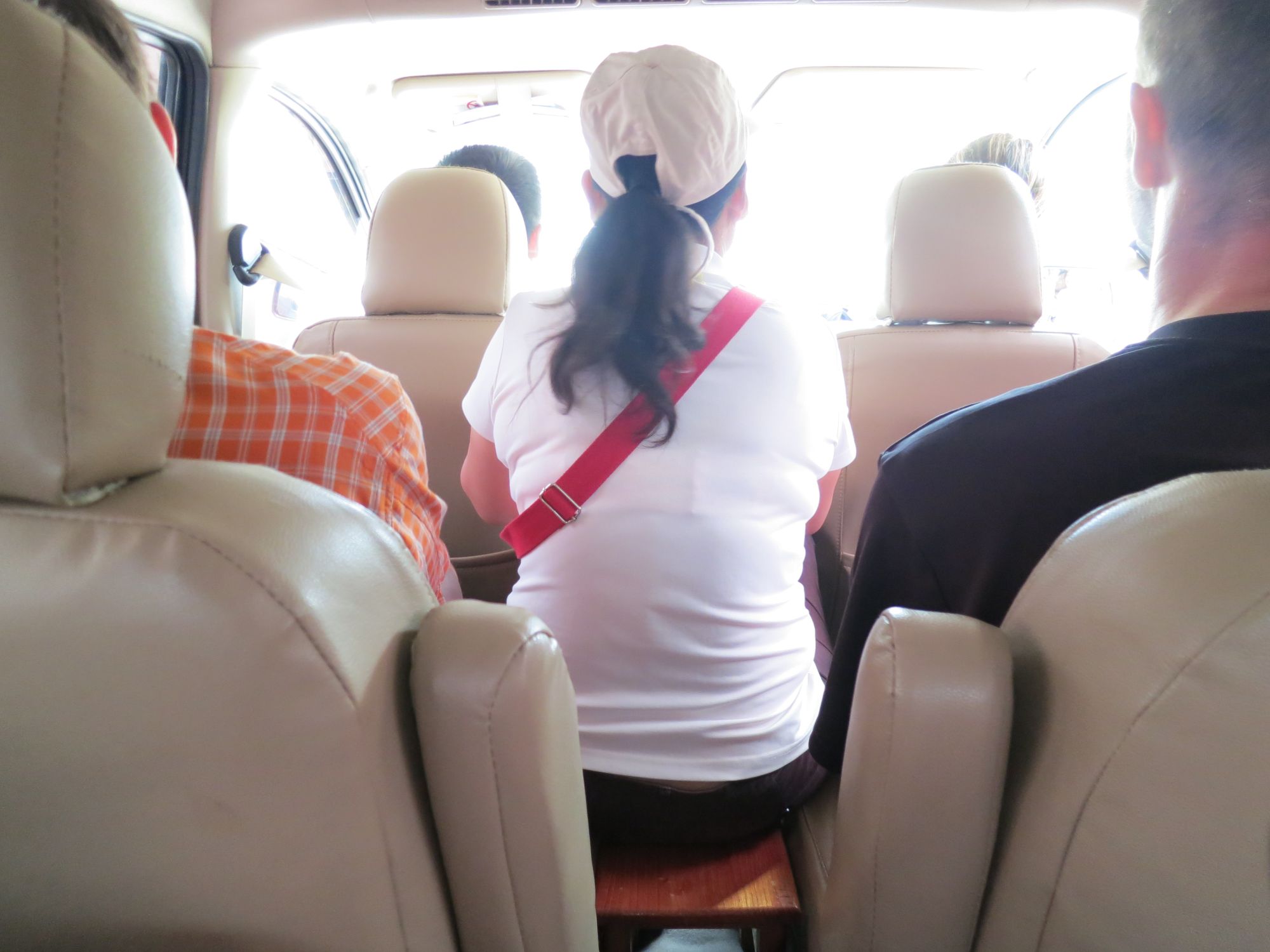 Nästa dag började bra, på med solkräm efter att de värsta blekansiktena var lite rosa efter cyklingen i mulet väder, och förhoppningar att krämen skulle behövas. Guiden/biljettköperskan hade ordnat en bil, men glömt att tänka på hur många vi var plus att hon själv skulle få plats. Men de 6 passagerarplatserna kunde bli 7 med ett enkelt tillbehör. Dock fick hon faktiskt själv ta den ytterst bekväma och säkra platsen.