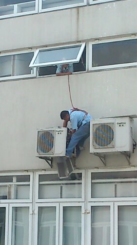 Känns ju skönt att vara säkrad med en livlina som en kollega håller i handen. Detta är dock inte så högt, bara typ 1 våning ner till ett skärmtak, så inte sååå dramatiskt om kollegan som håller i linan släpper för att han får telefon eller nåt…