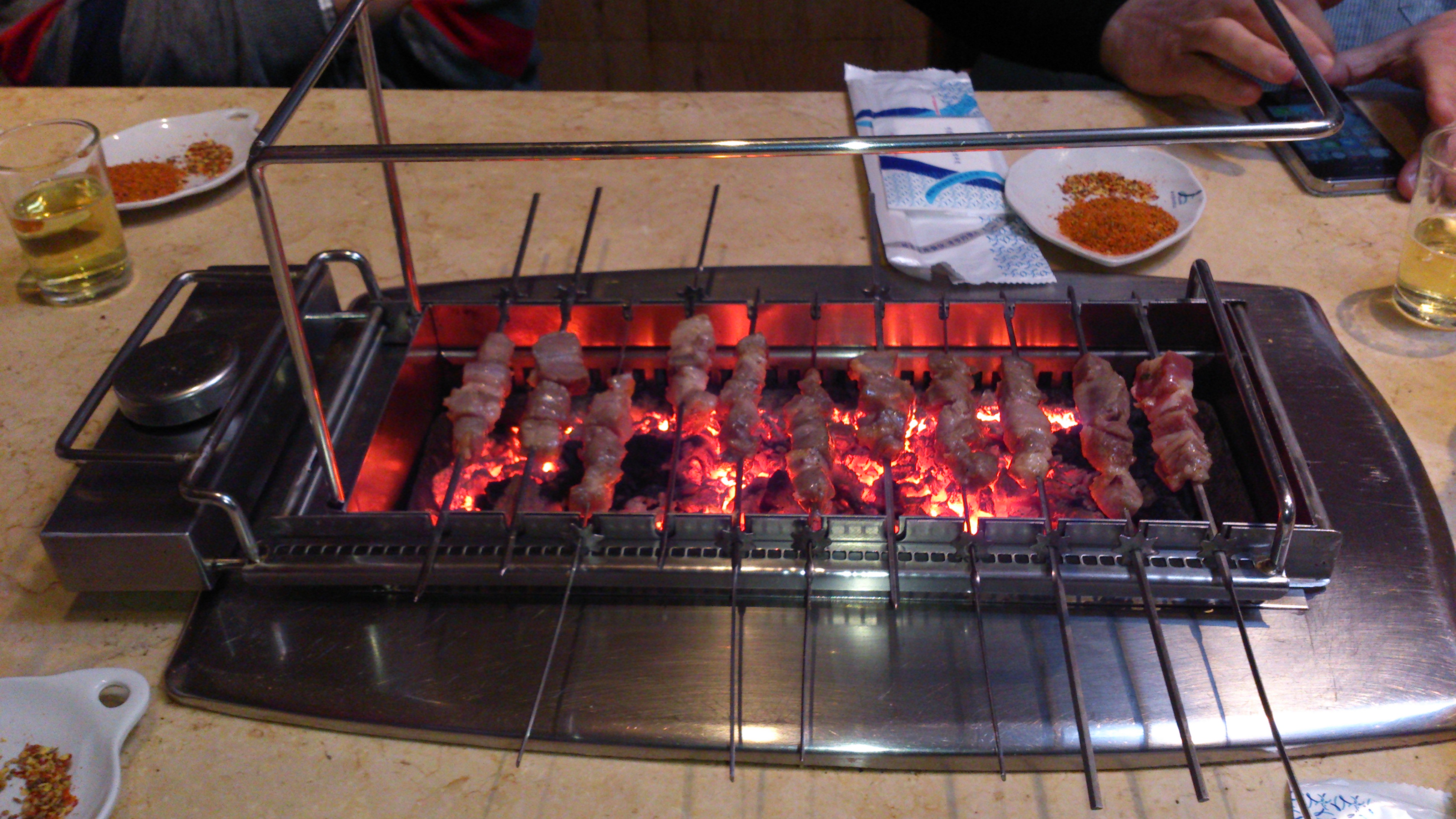 Mätt! Har ätit typ en miljard små grillspett från urvalet lamm, biff, fläsk, grönsaker, kycklingnjure, kycklingmage, vaktel, duva, räka, svamp, tofu. Trevligt sällskap, en svenne, en belgare och tre glada pratsamma kineser på en riktig kinesisk grillrestaurang. Värmde gott i kylan!