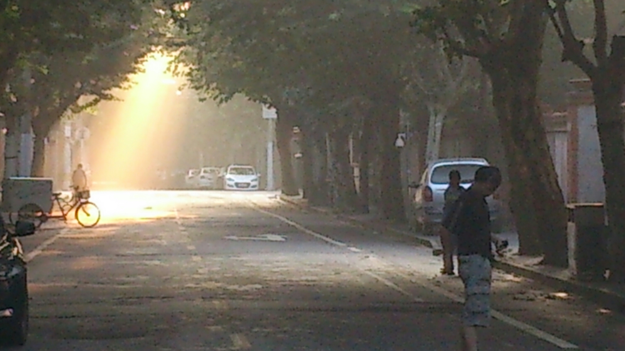 Inte bara regnet som strilar, även morgonsolen genom platanernas lövverk, klockan 06 på morgonen.