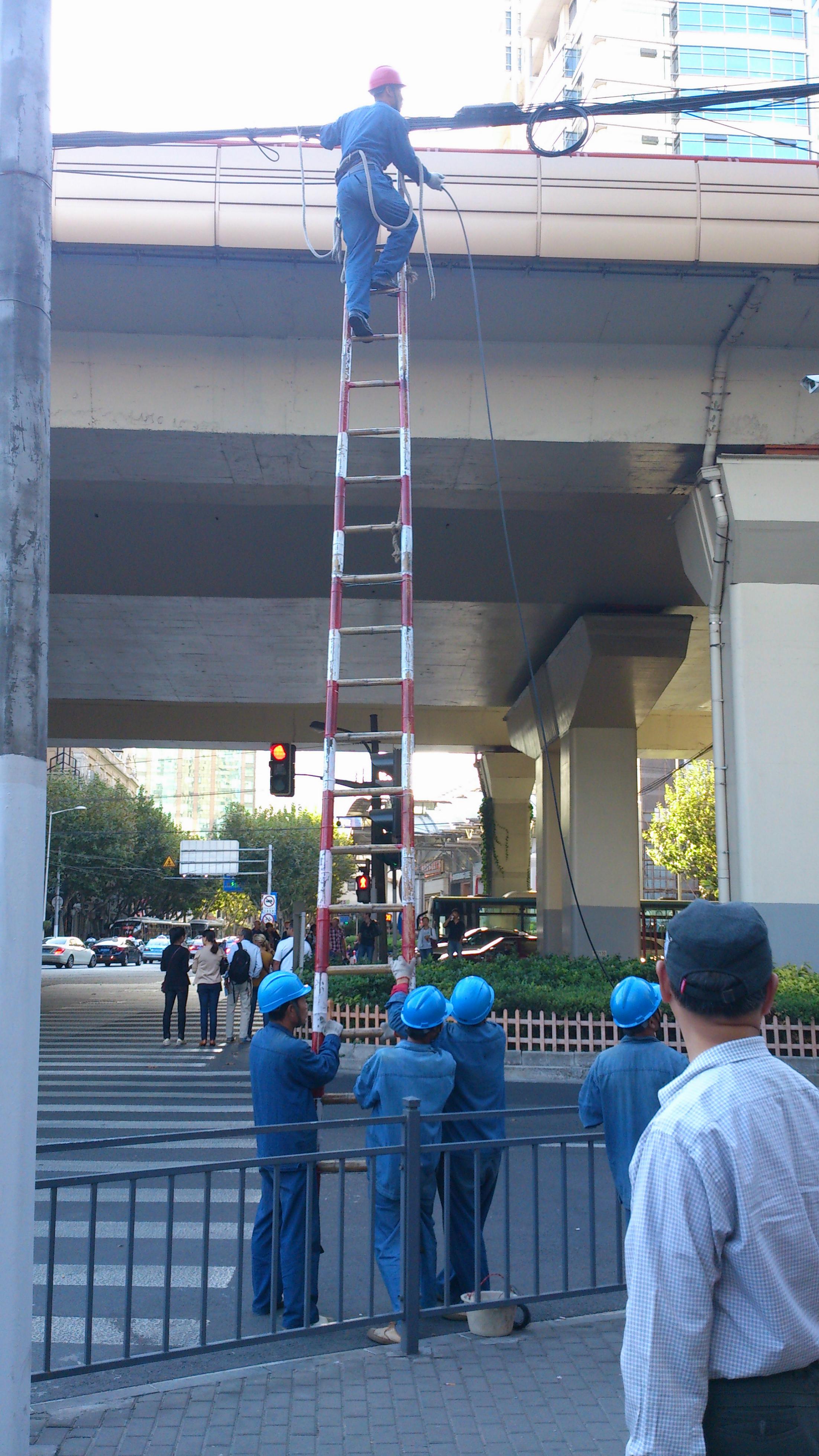 Detta är en del i EvLah:s serie ”Kinesiska män gör saker tillsammans”, som hon och jag samlade på oss en lördagspromenad på stan. En som klättrar och tre som håller, minst en som arbetsleder…