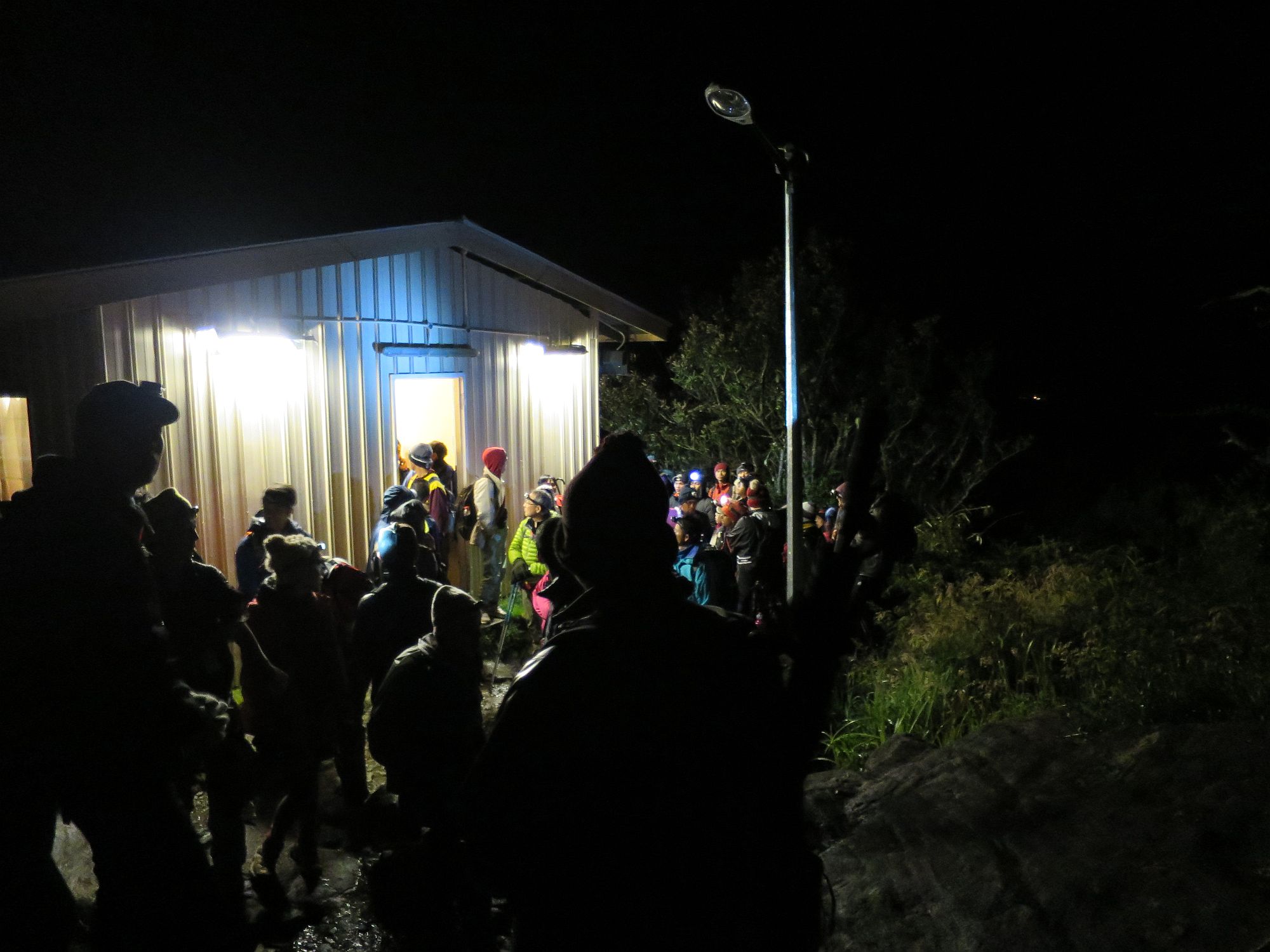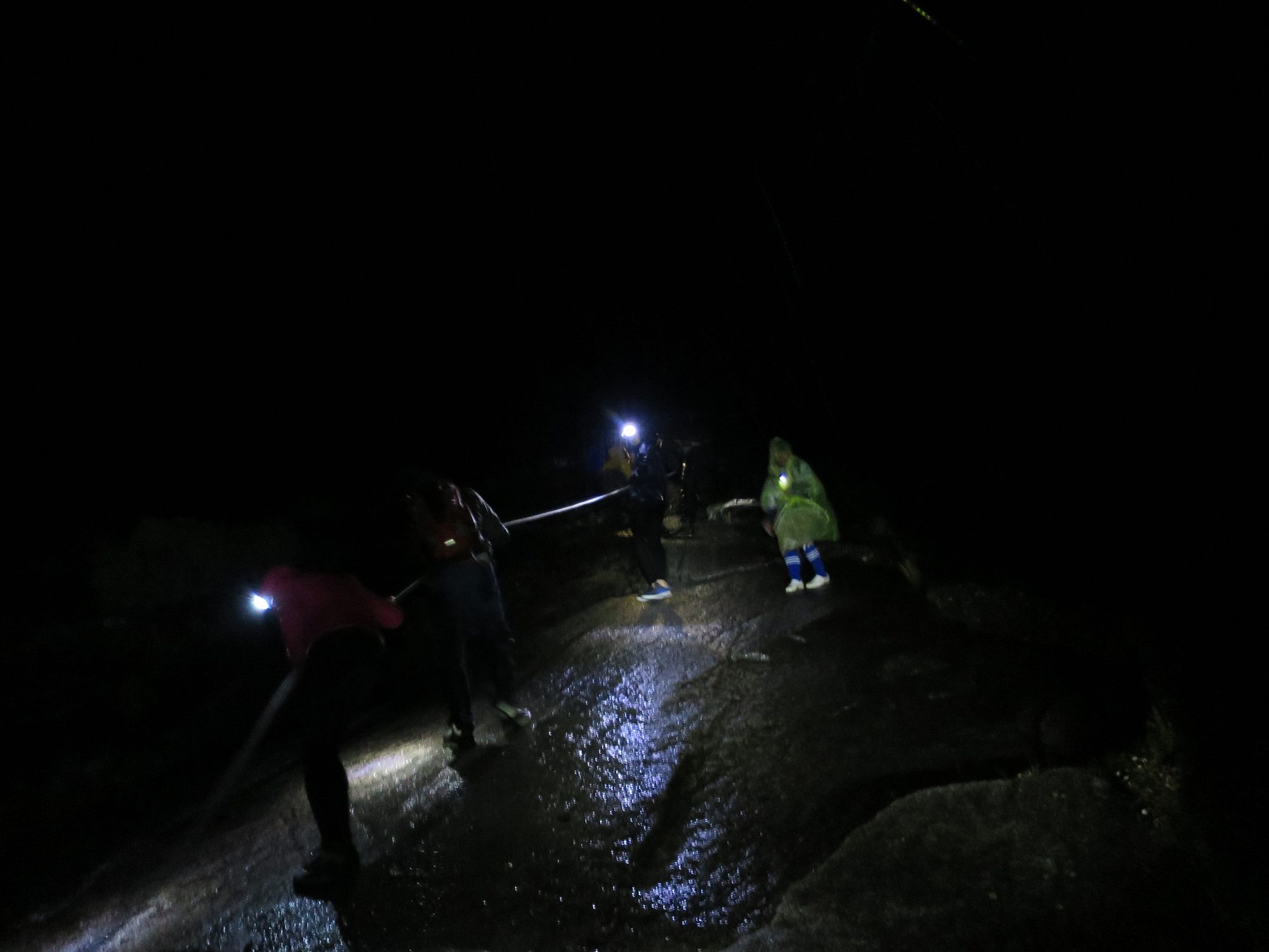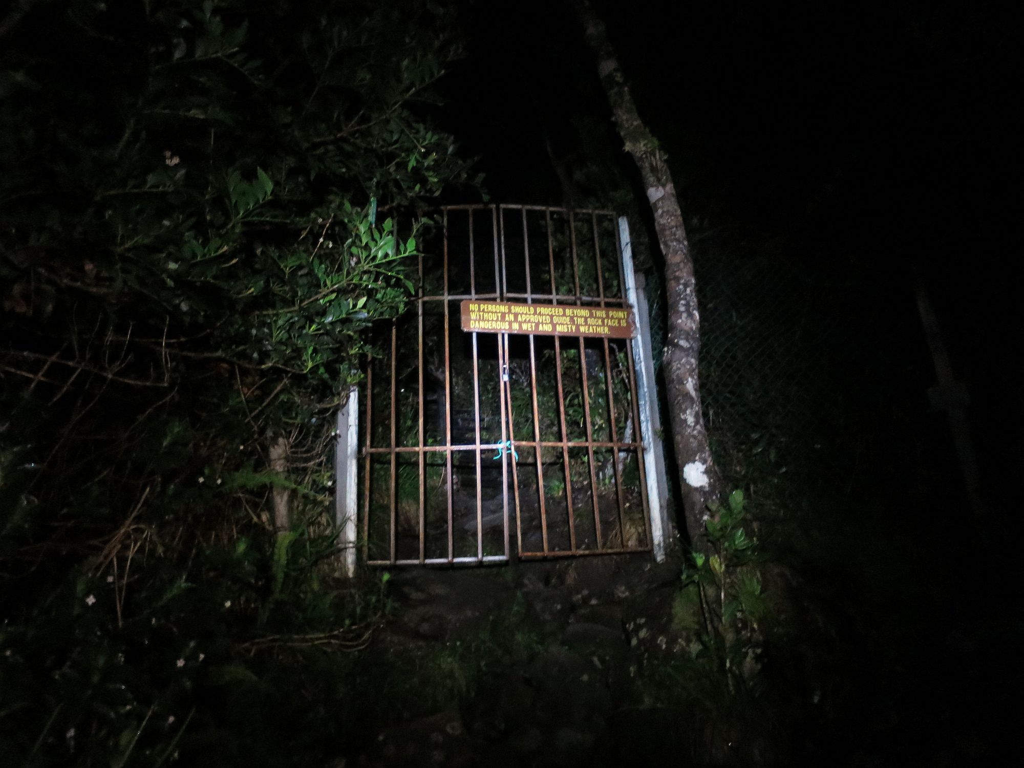 Men vad f-n… vi kommer ca 50 höjdmeter, grinden upp till vandringsleden är låst, och ingen av guiderna verkar veta hur man får tag på parkvakten. Eller är leden stängd pga väderprognosen? Ingen vet. Många pannlampor står och bländar varann och gäspar.
