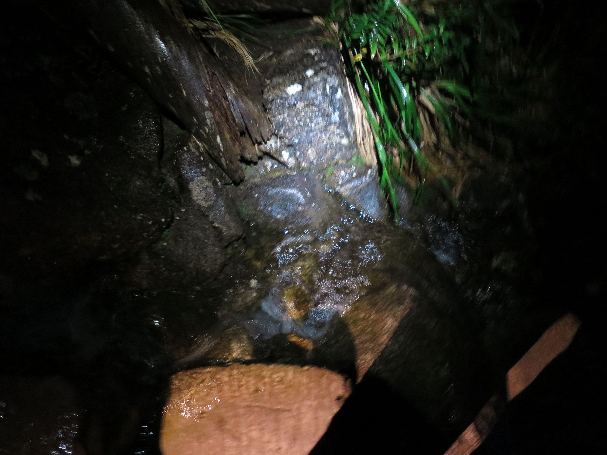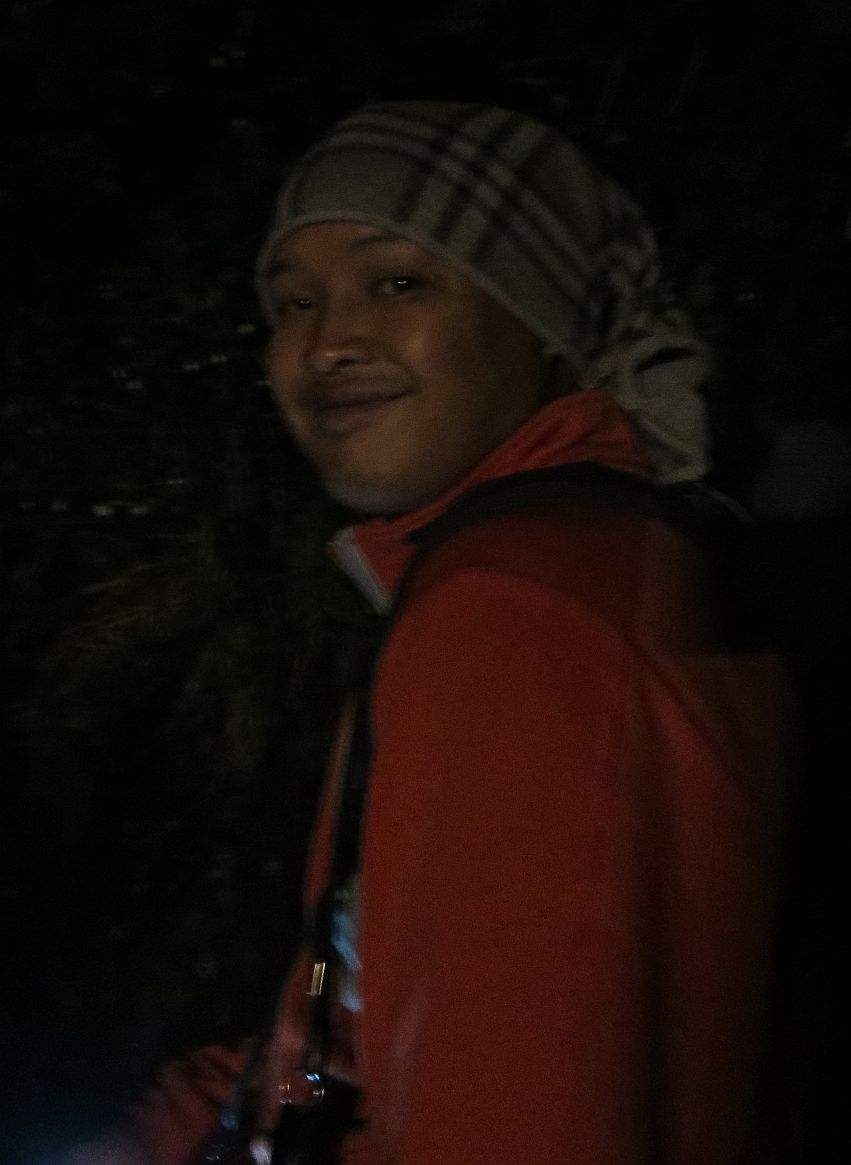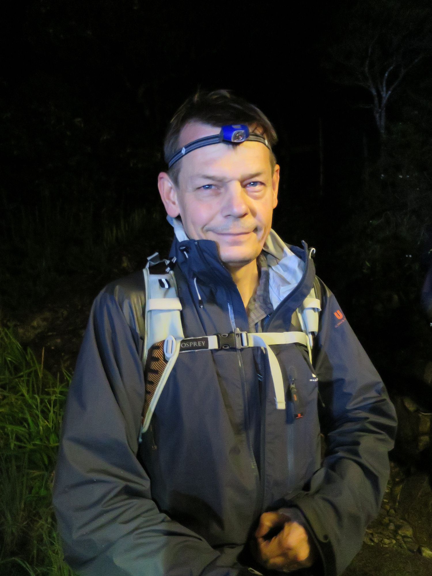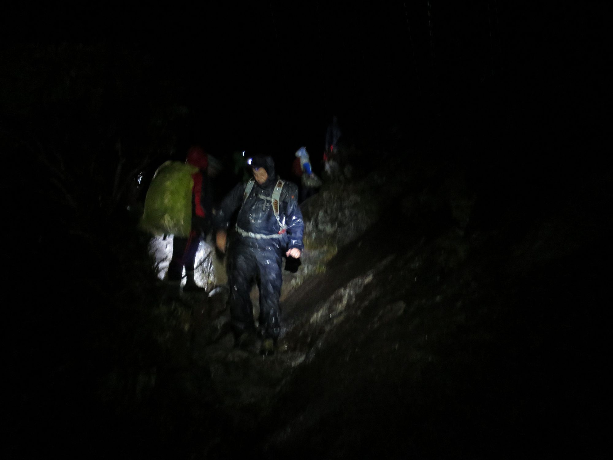 Men vad f-n… vi kommer ca 50 höjdmeter, grinden upp till vandringsleden är låst, och ingen av guiderna verkar veta hur man får tag på parkvakten. Eller är leden stängd pga väderprognosen? Ingen vet. Många pannlampor står och bländar varann och gäspar.