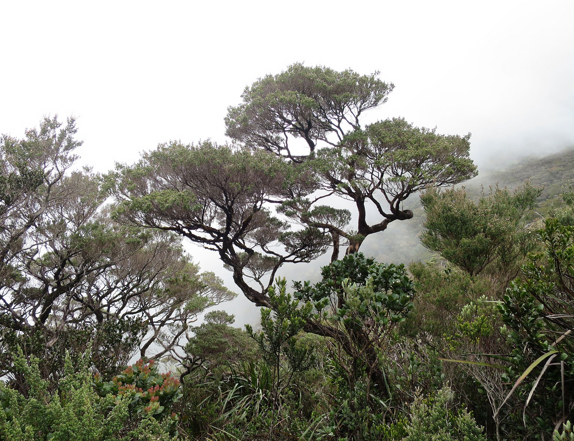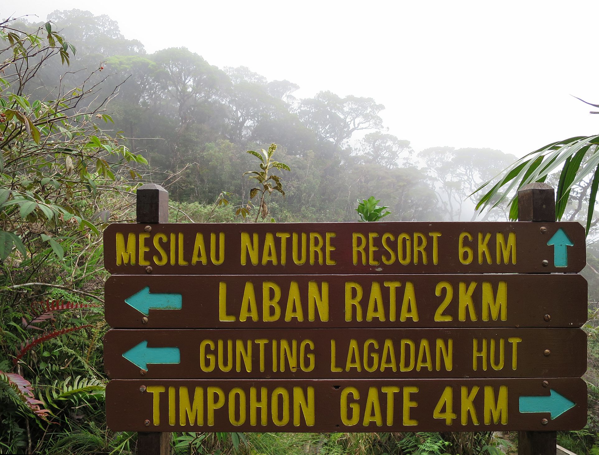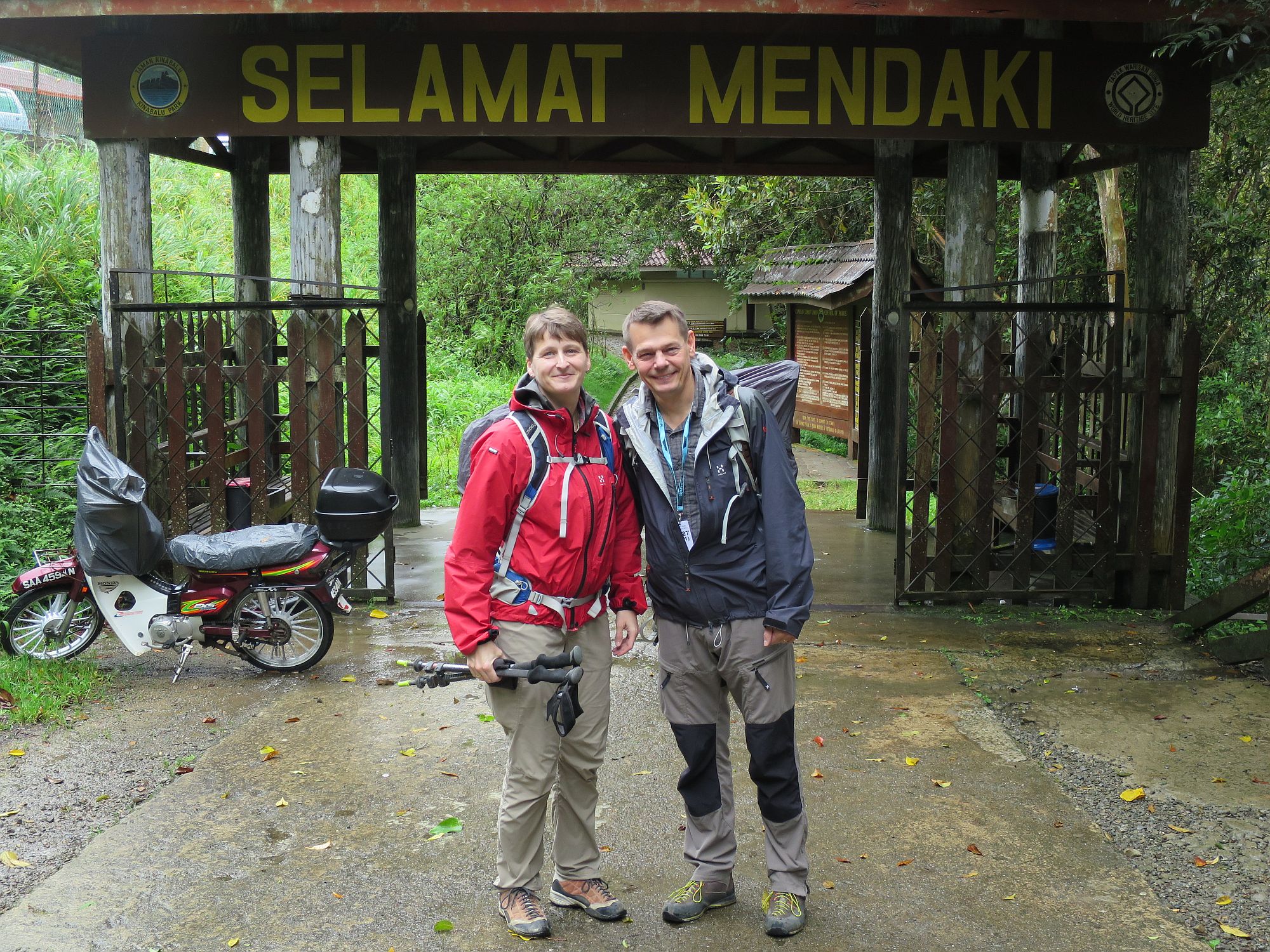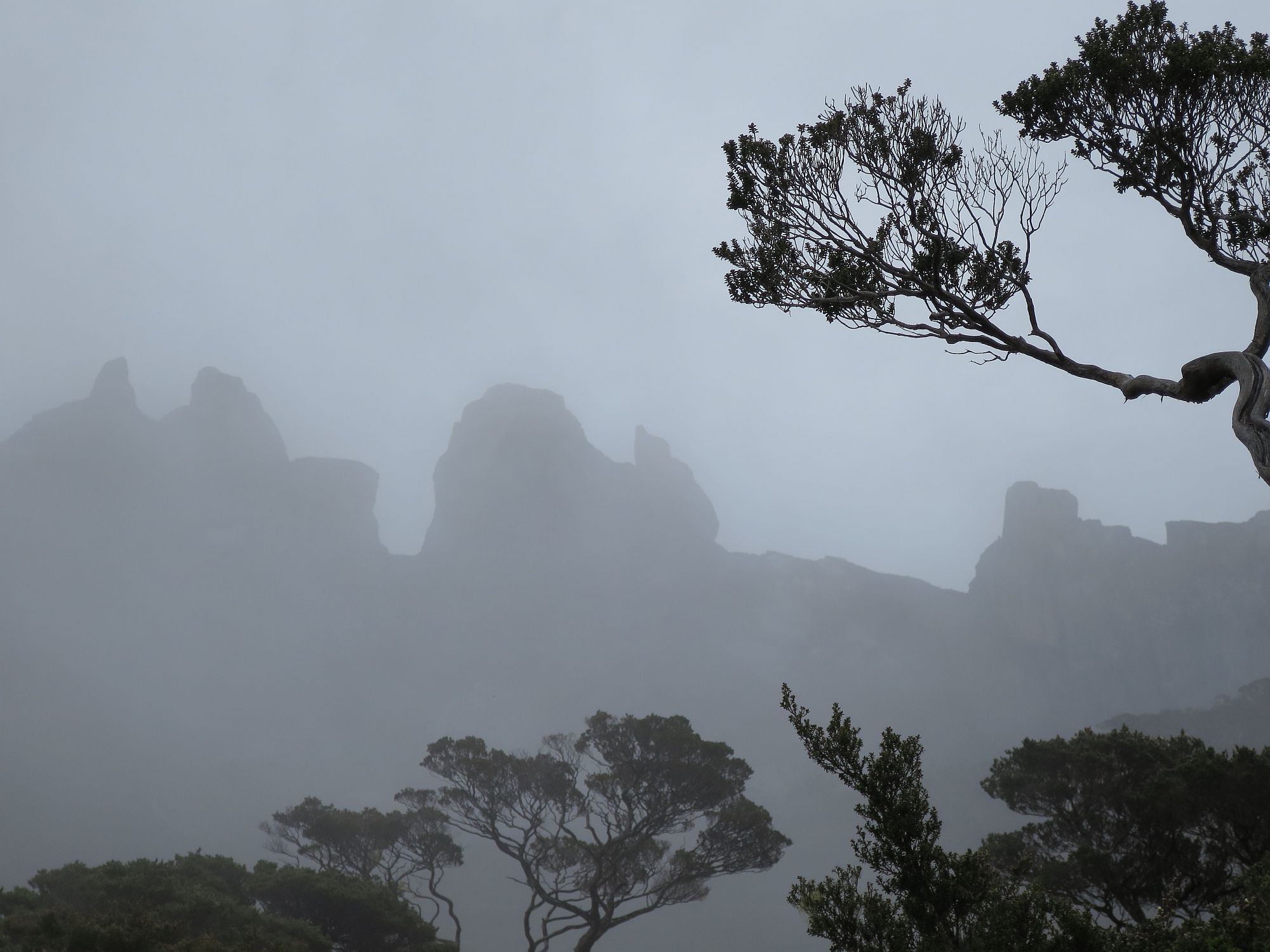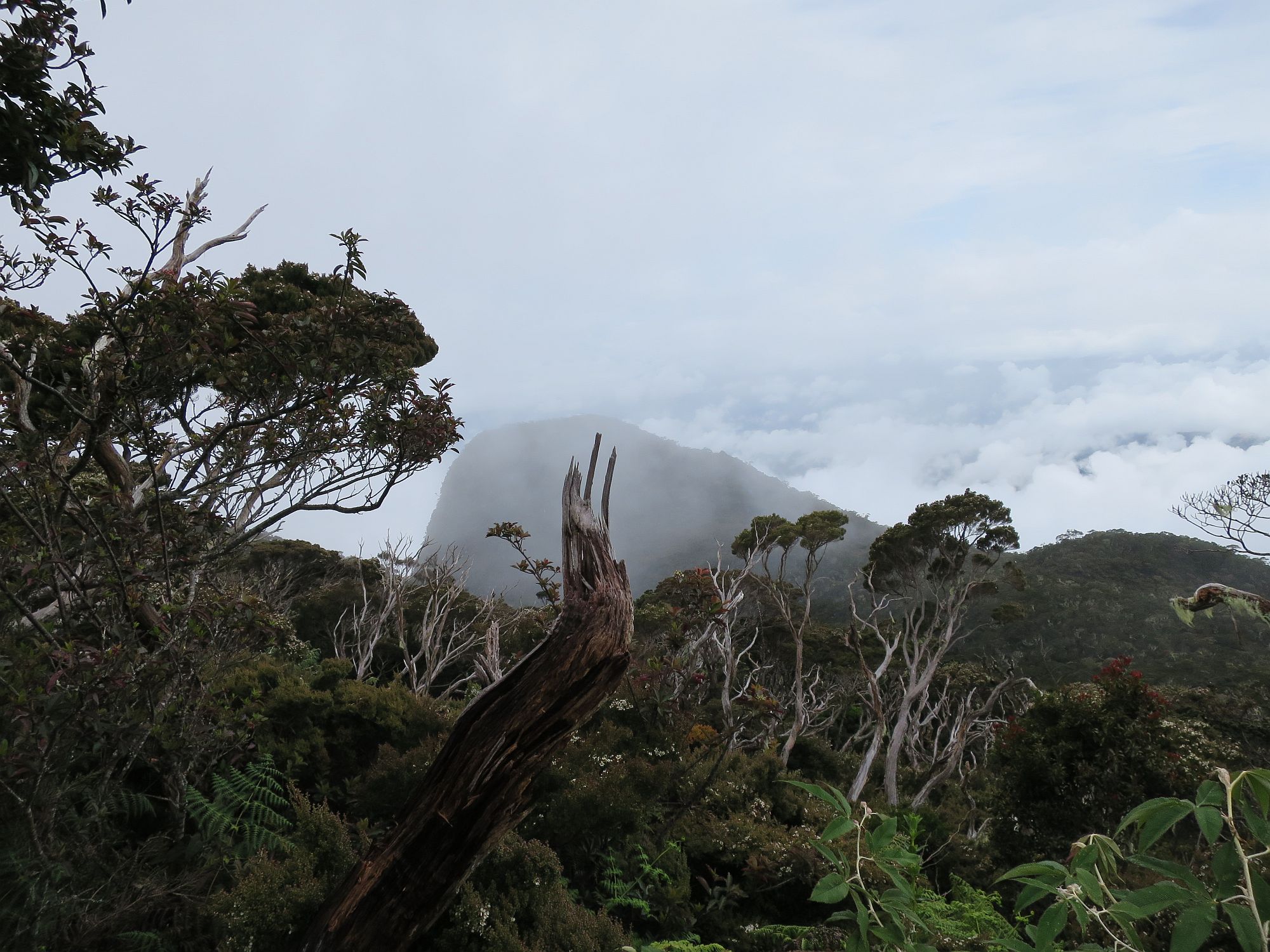 Fortfarande få nära efter oss. Men oavsett med regnkläder på, det blåser hårt i regnet, kyler snabbt. Och tanken på hur man ska kunna gå nerför branta hällregnshällar? Och komma över de exponerade passagerna högre upp på väg mot toppen? Guiden säger konstigt nog att vi får välja om vi vill fortsätta. Det är ju vad vi förväntar oss att en guide ska avgöra, vad som är rätt, fortsätta eller bryta. Eller att parken helt enkelt stänger berget när det är för dåligt väder, både regn och vind. Vi väljer att bryta. Möter en massa personer som inte ens kommit upp ur skogen ännu, som verkar tycka att vi är mesiga och tar konstigt beslut, det mumlas bara. Jaja, beslutar inte guiderna så får väl var och en göra det, vi kan ju bara beskriva hur det sett ut högre upp, och utan vindskydd från skogen. Hejdå!