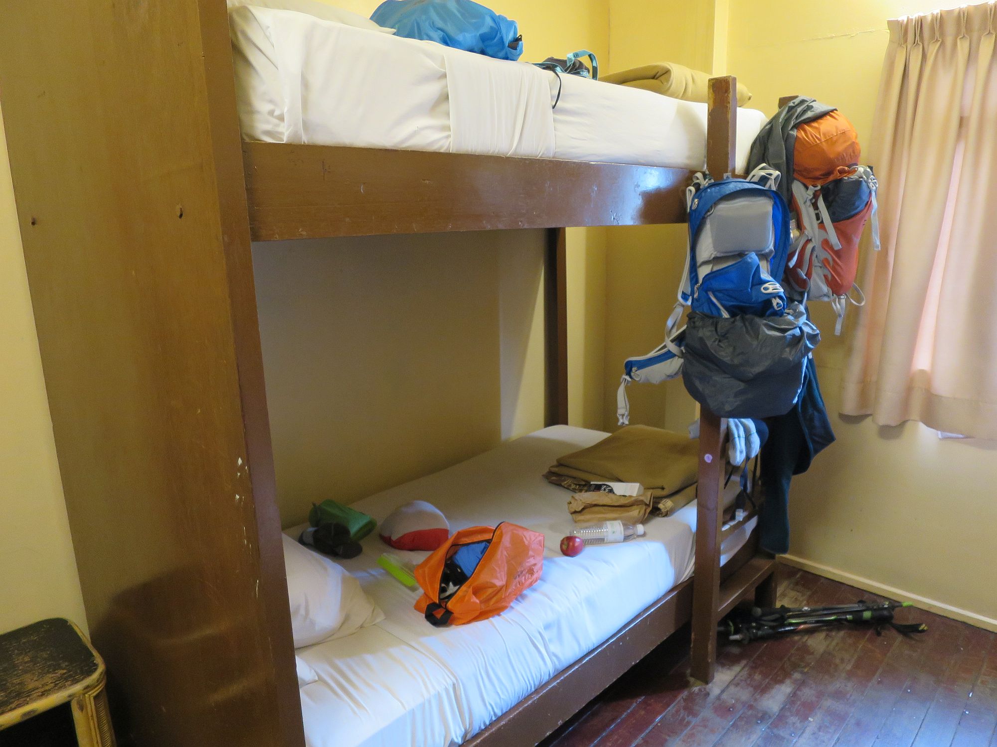 Ingen stress egentligen, vi ska bara vandra 6 km idag, men när man upptäcker att klockan man ställt på morgonringning inte hörs när den ligger åt ett visst håll, och man vaknar en timme senare än avsett… suck. OK, vi ser i alla fall det berg vi siktar på från stugan vi bor i, även om vi inte ser toppen. Frukost och klura ut hur man hittar sin guide, och hur man lämnar all sin packning utom det man behöver för 2 korta dagsvandringar med en vandrarhemsnatt emellan.