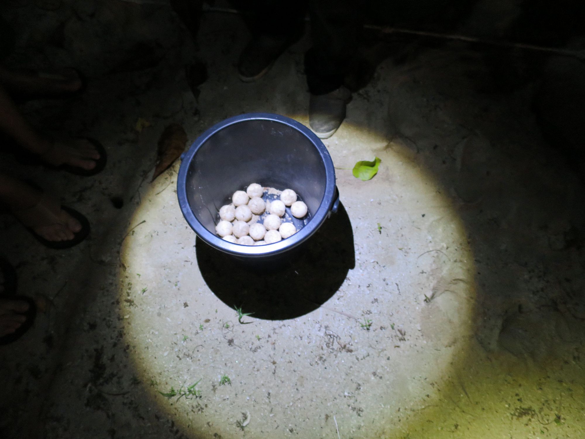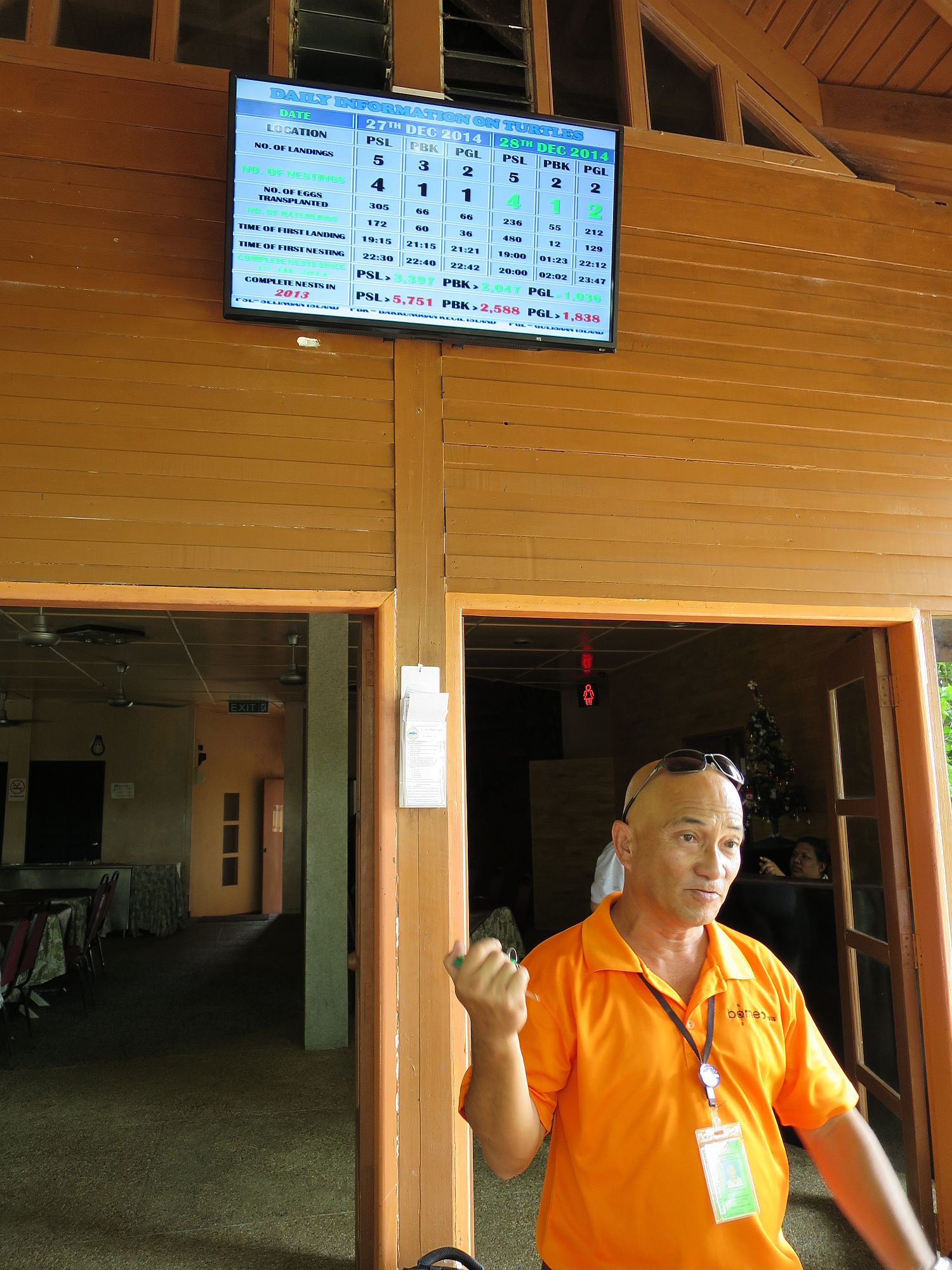 Glen förklarar sköldpaddscentrats ”övervakningssystem” och senaste 2 nätternas resultat. Igår, 28 december, kom det 5 sköldpaddor till PSL (ön Pulau Selingaan som vi är på), och 4 av dem la ägg, totalt 236 st, och 450 tidigare lagda ägg kläcktes.