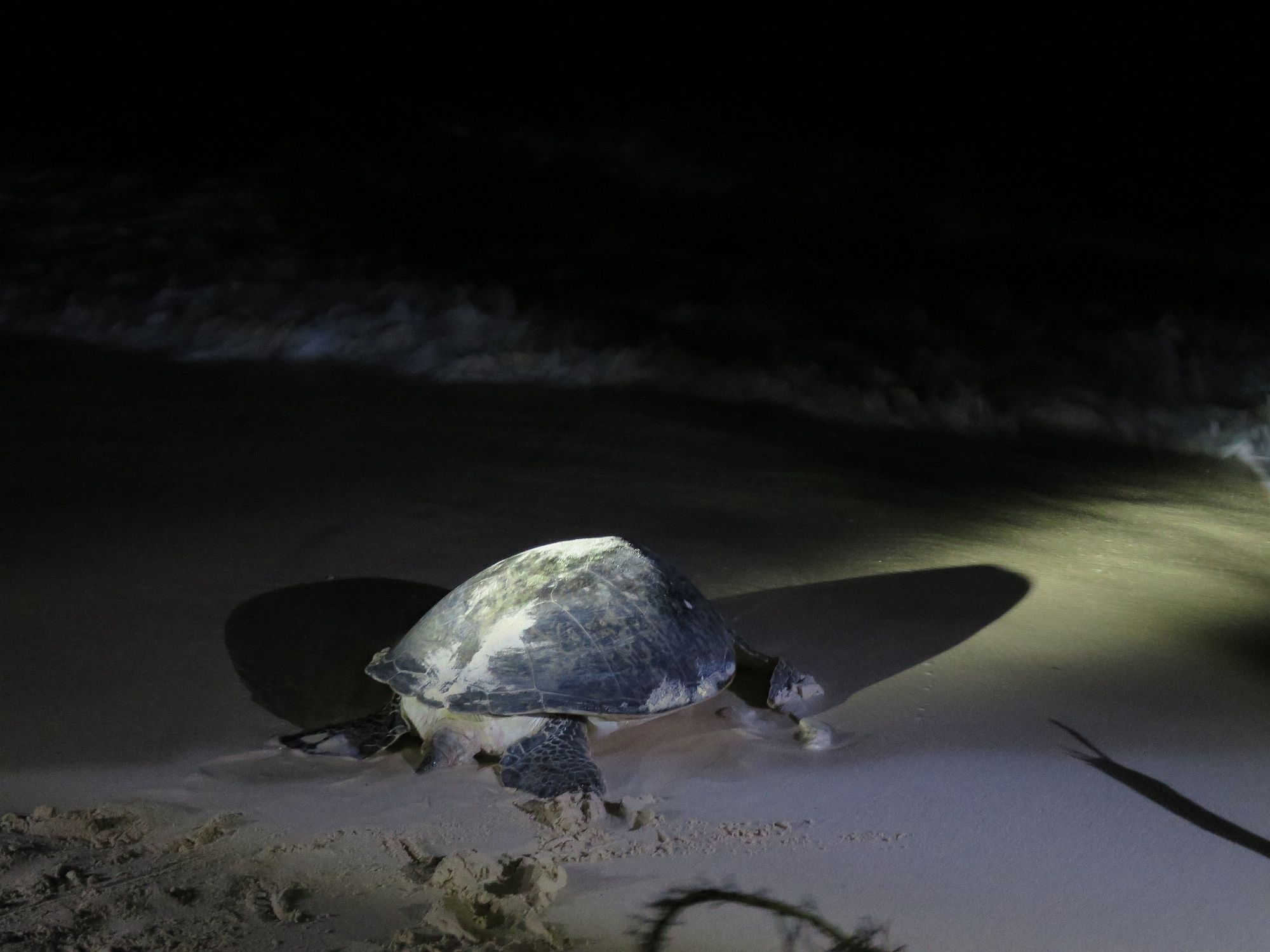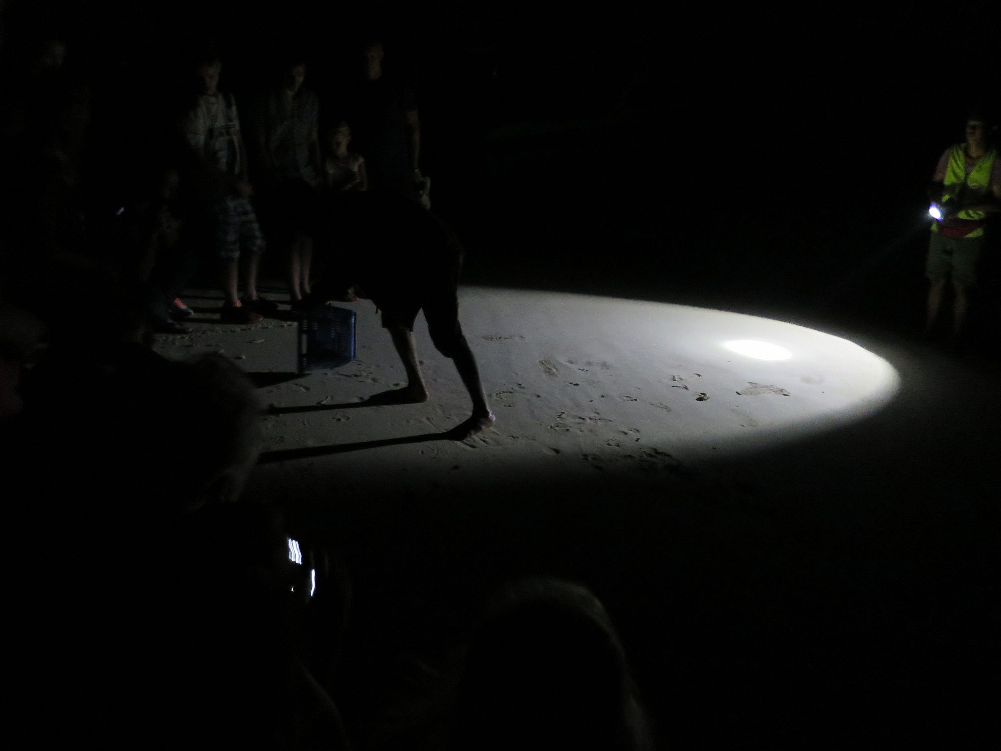 Sen, väntan väntan väntan… tills de ropade ”Turtle Time!” En hona som har landat och lagt sina ägg ifred, sen kommer alla vi turister ut och tittar när hon ska lämna stranden. (Det visade sig sen att det kom bara en på hela natten.) Men först ska hon identifieras och mätas över skölden.