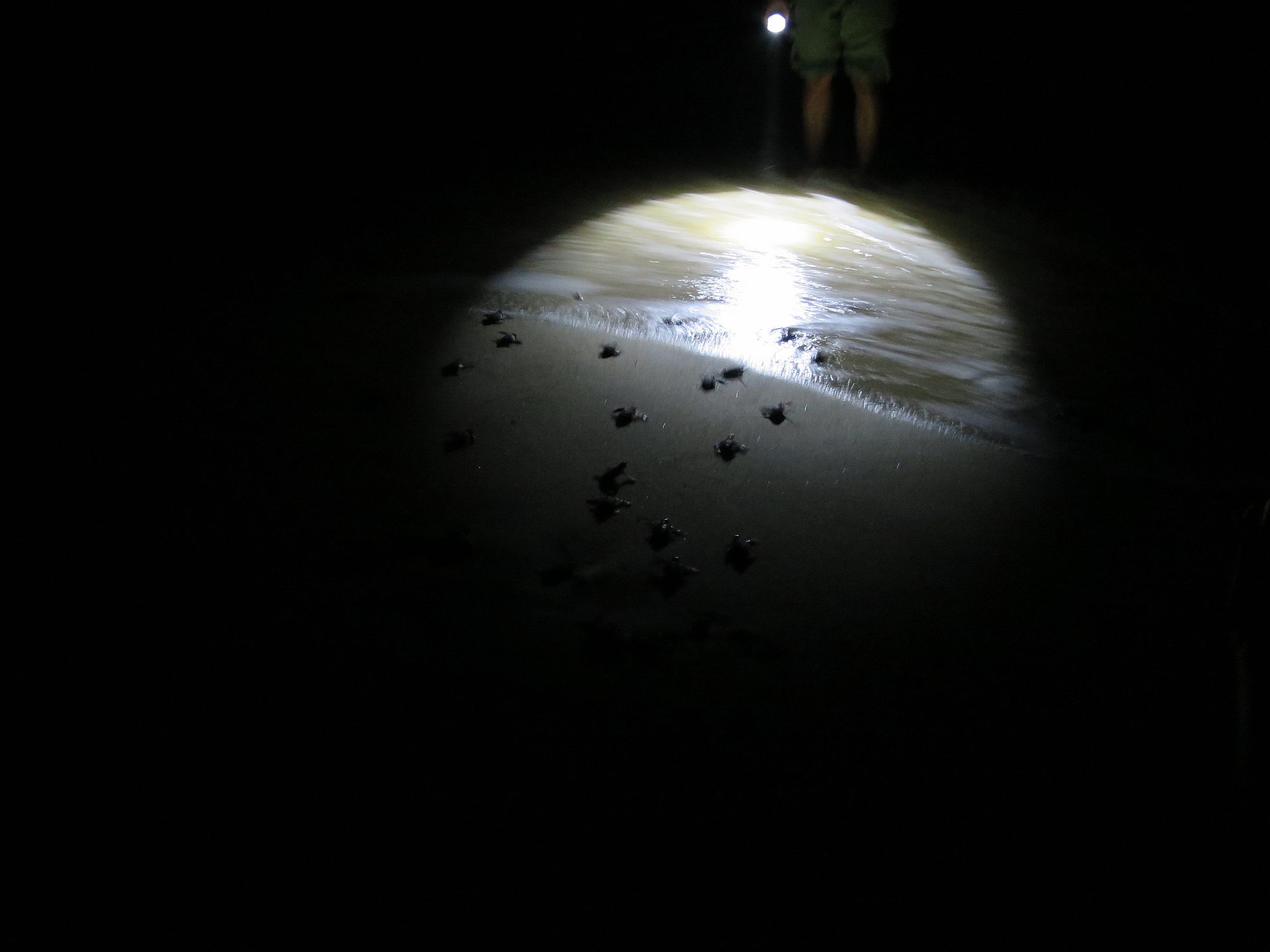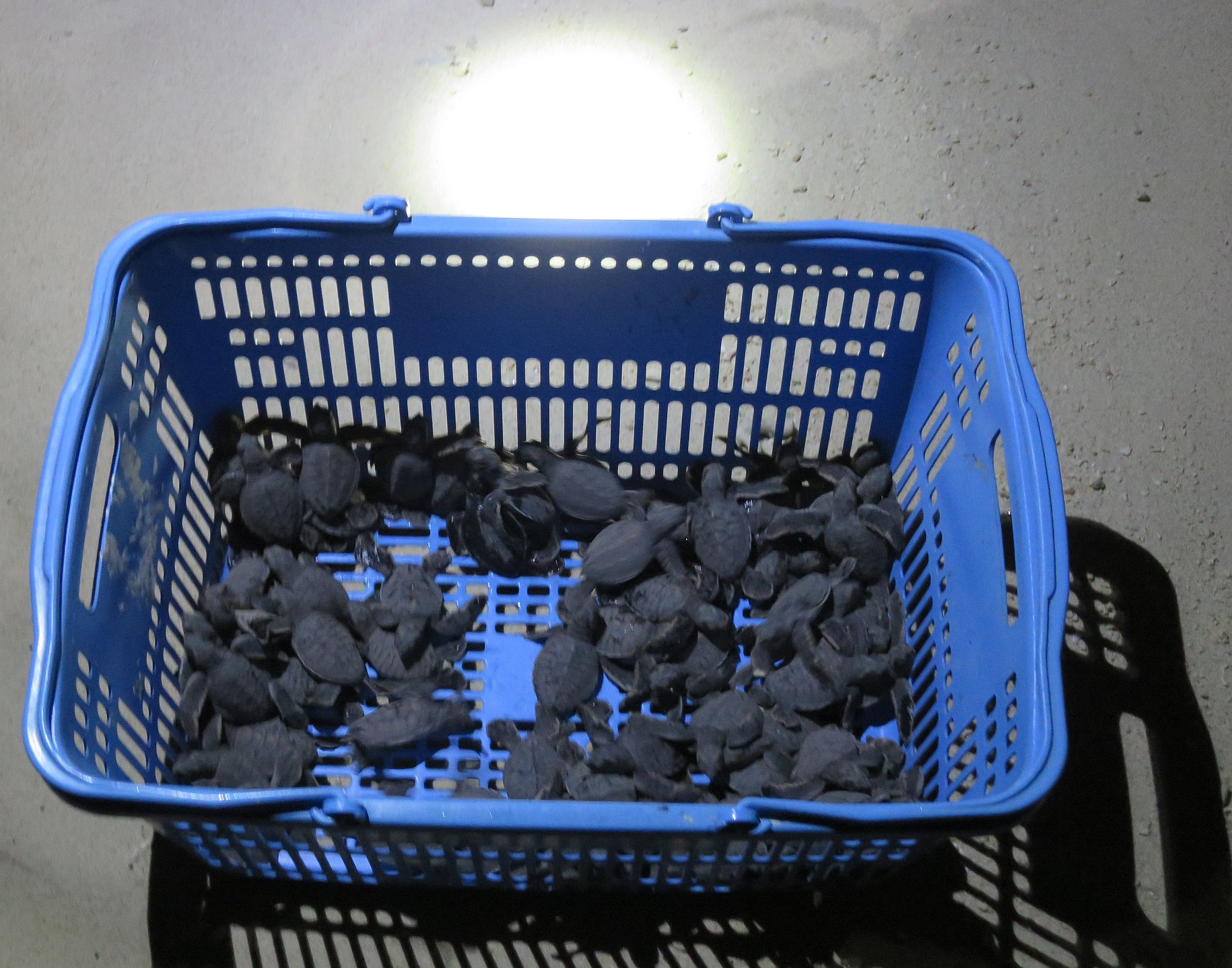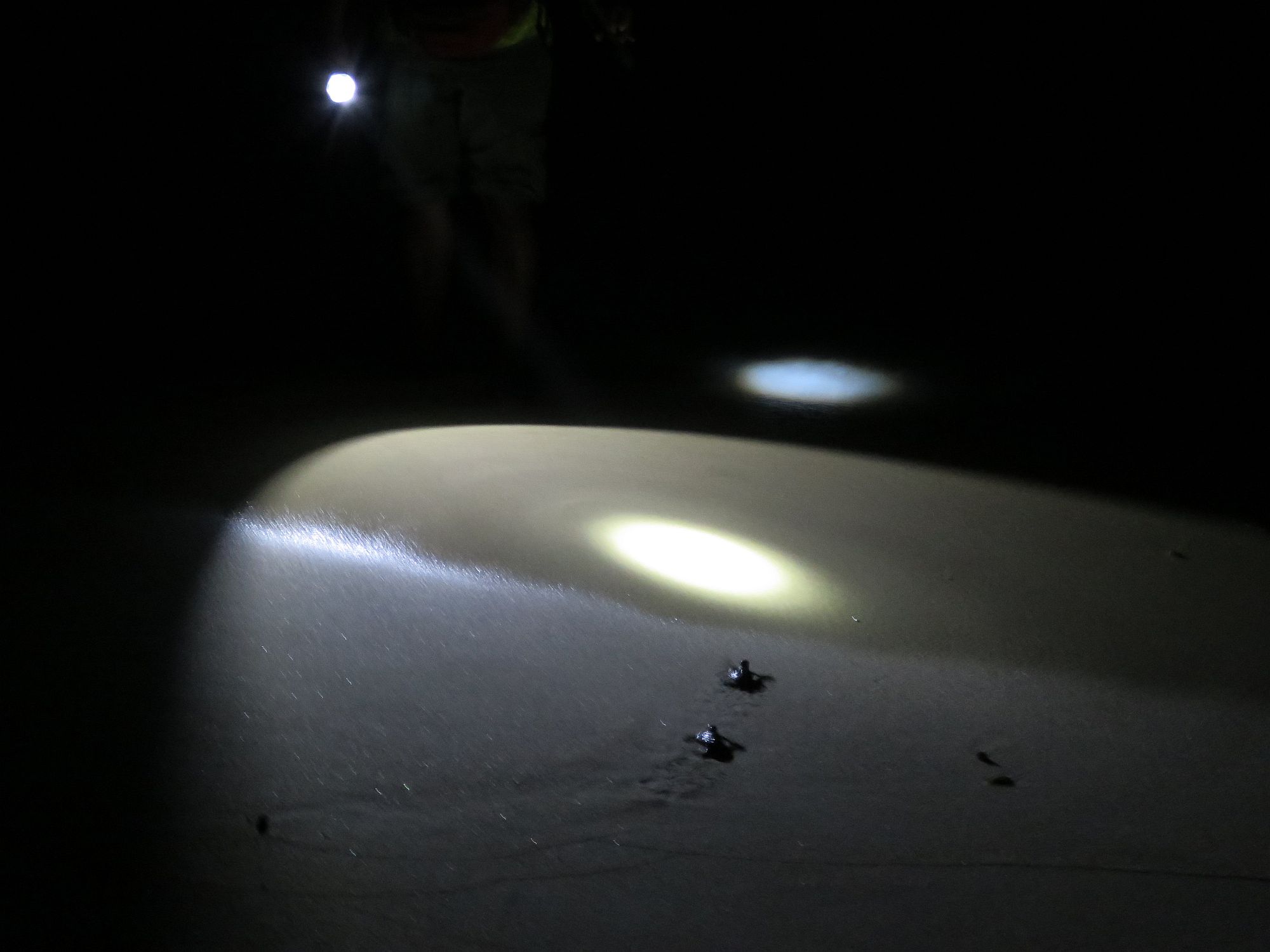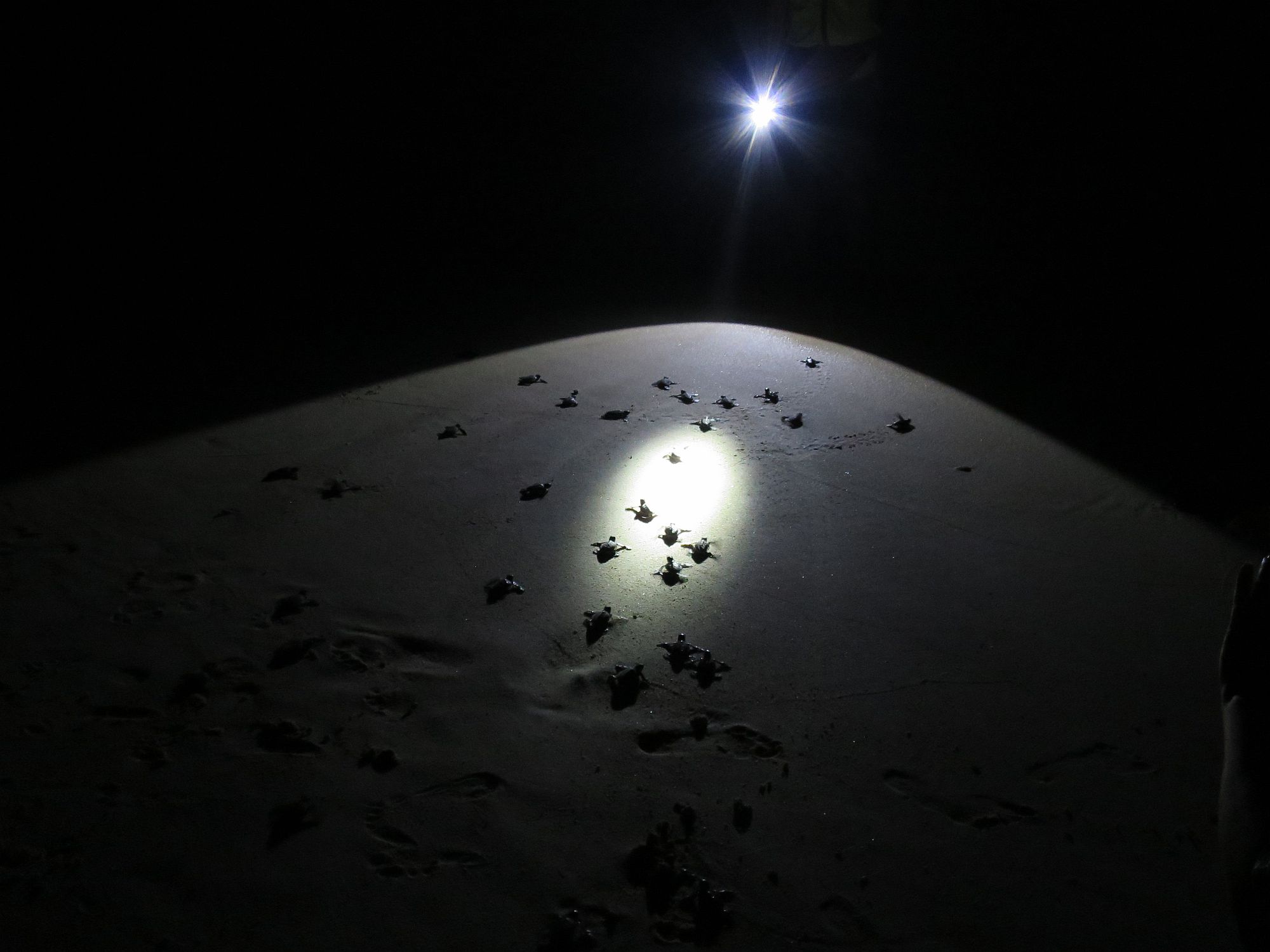 En laddning klara för sjösättning. Extremt gulliga! De är programmerade att följa ljuset från naturvårdaren, som står ute i strandbrynet och leder dem åt rätt håll.