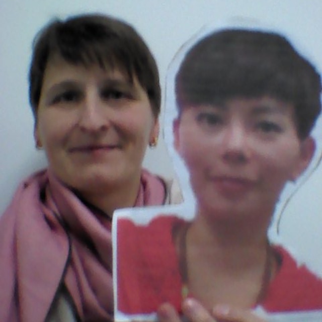 Avlägsen kollega närvarande i pappversion för gruppfoto. Girlpower!