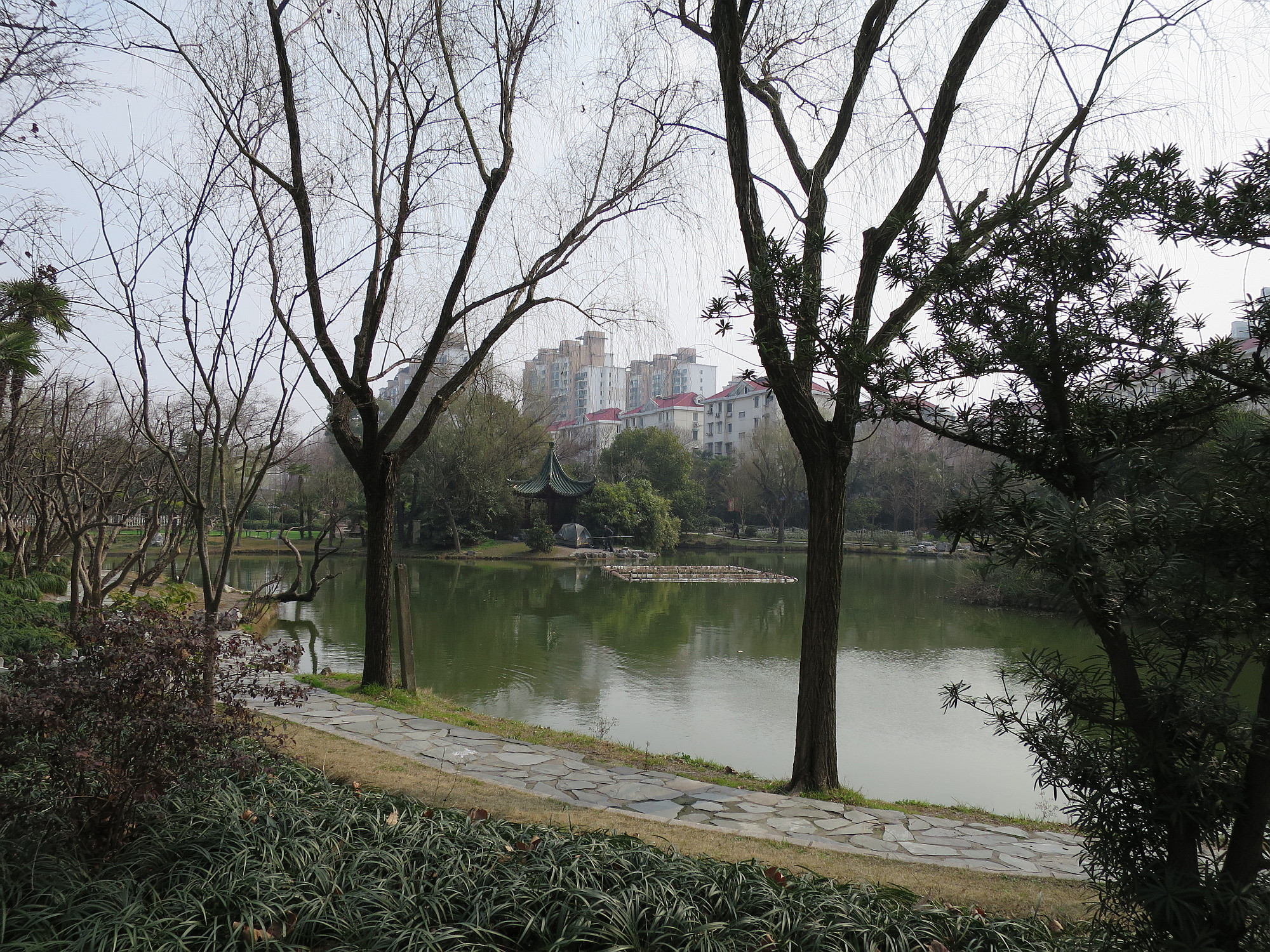 Friluftsliv på kinesiska, i Changfeng Park. Tält och fiske, med höghus i bakgrunden!