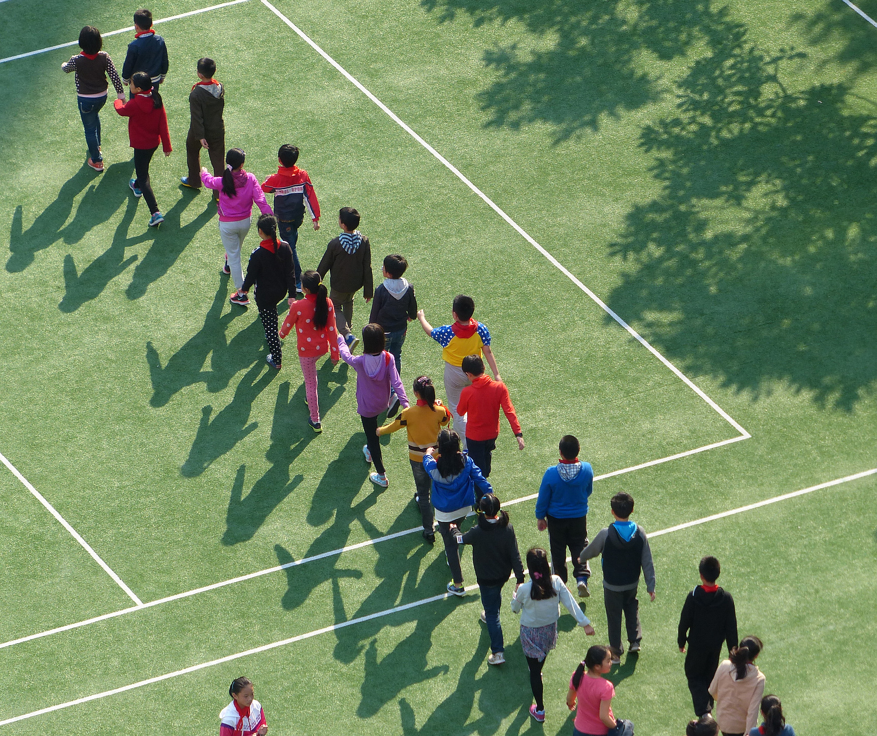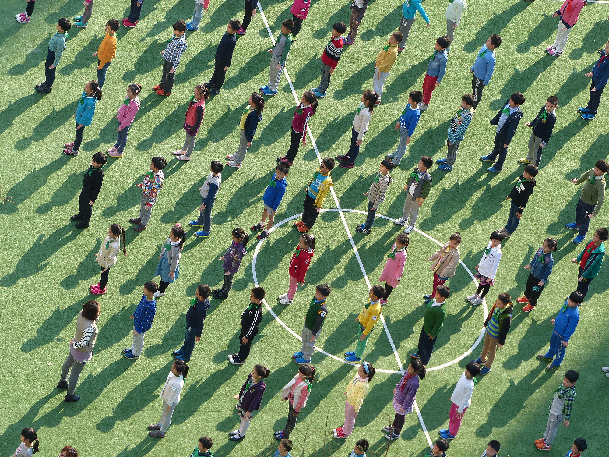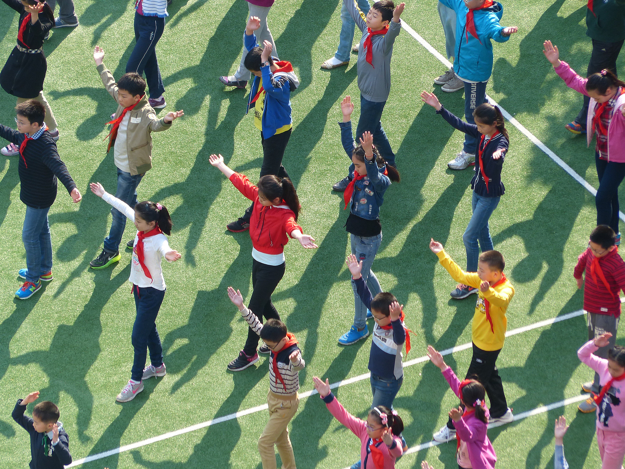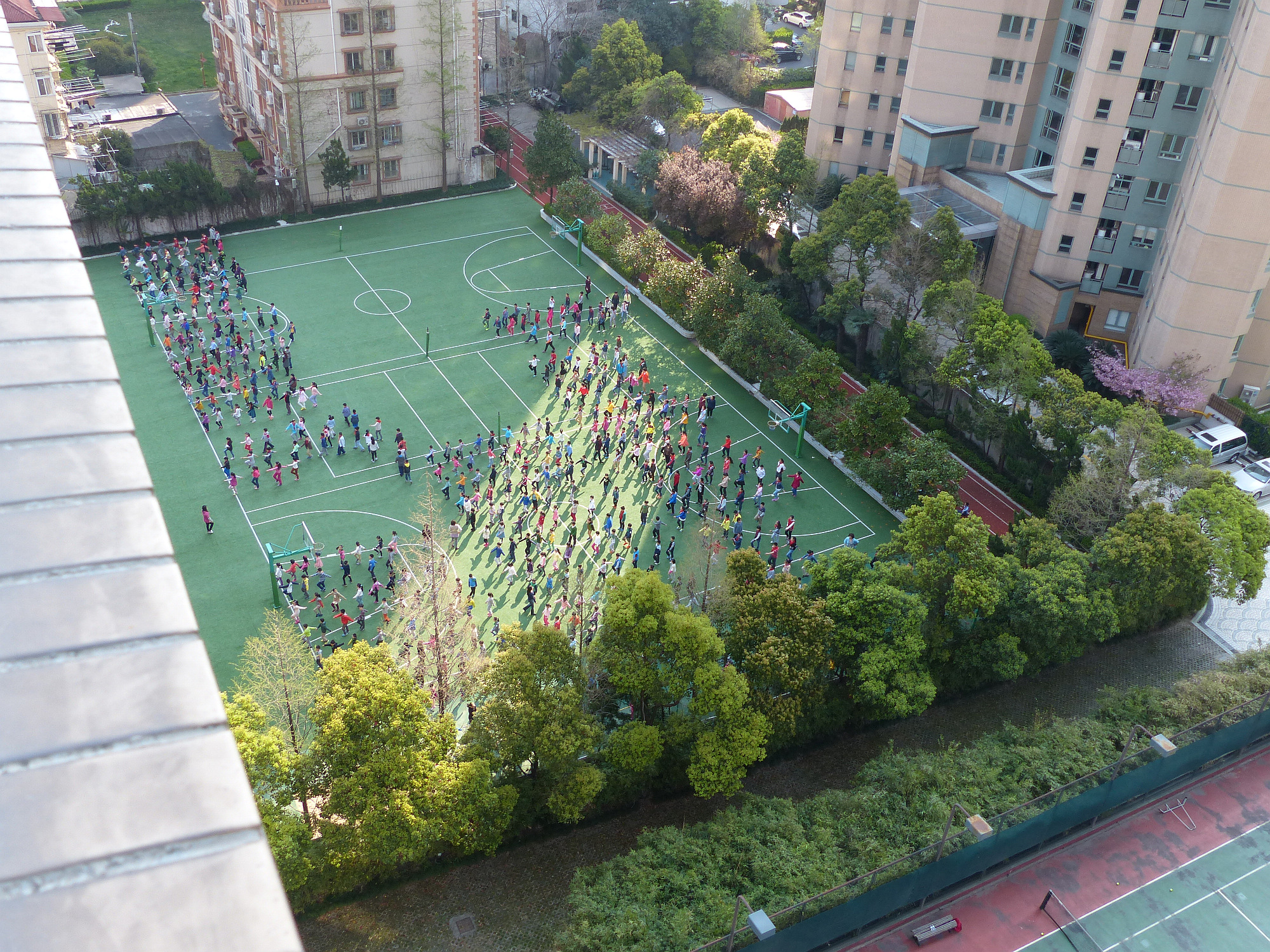 Skolan intill, morgongymnastik. Man kan fatta att ingen på jobbet drar sig för att uppträda på scen i olika former av gruppdans, de kan det här redan!