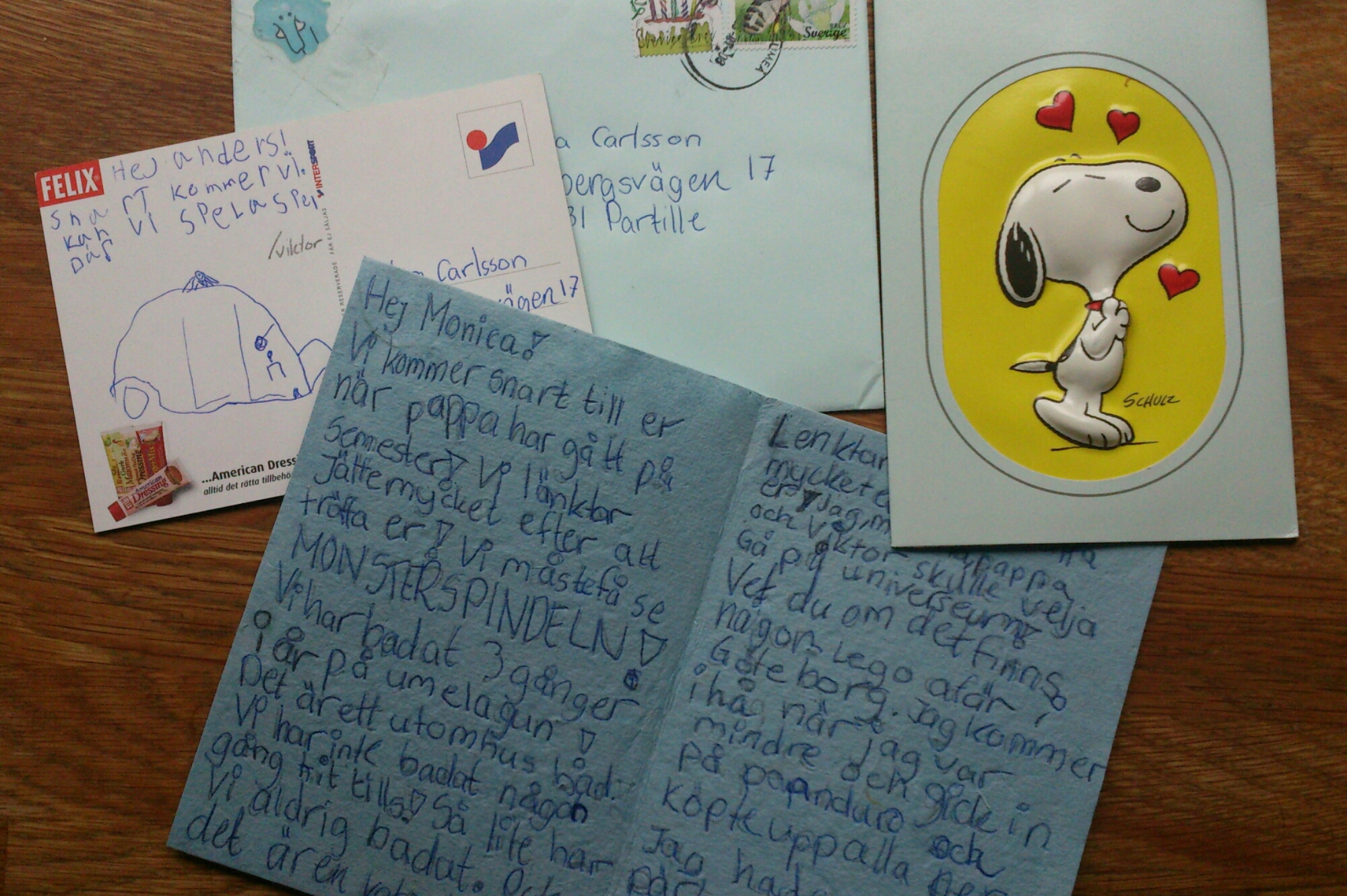 Vår brevlåda fungerar! Fina brev från M&V, till oss båda! Och till monsterspindeln i garaget!