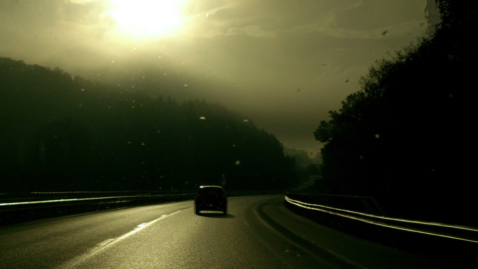 On the road again! Mys-morgon, solen bryter igenom morgondimman.