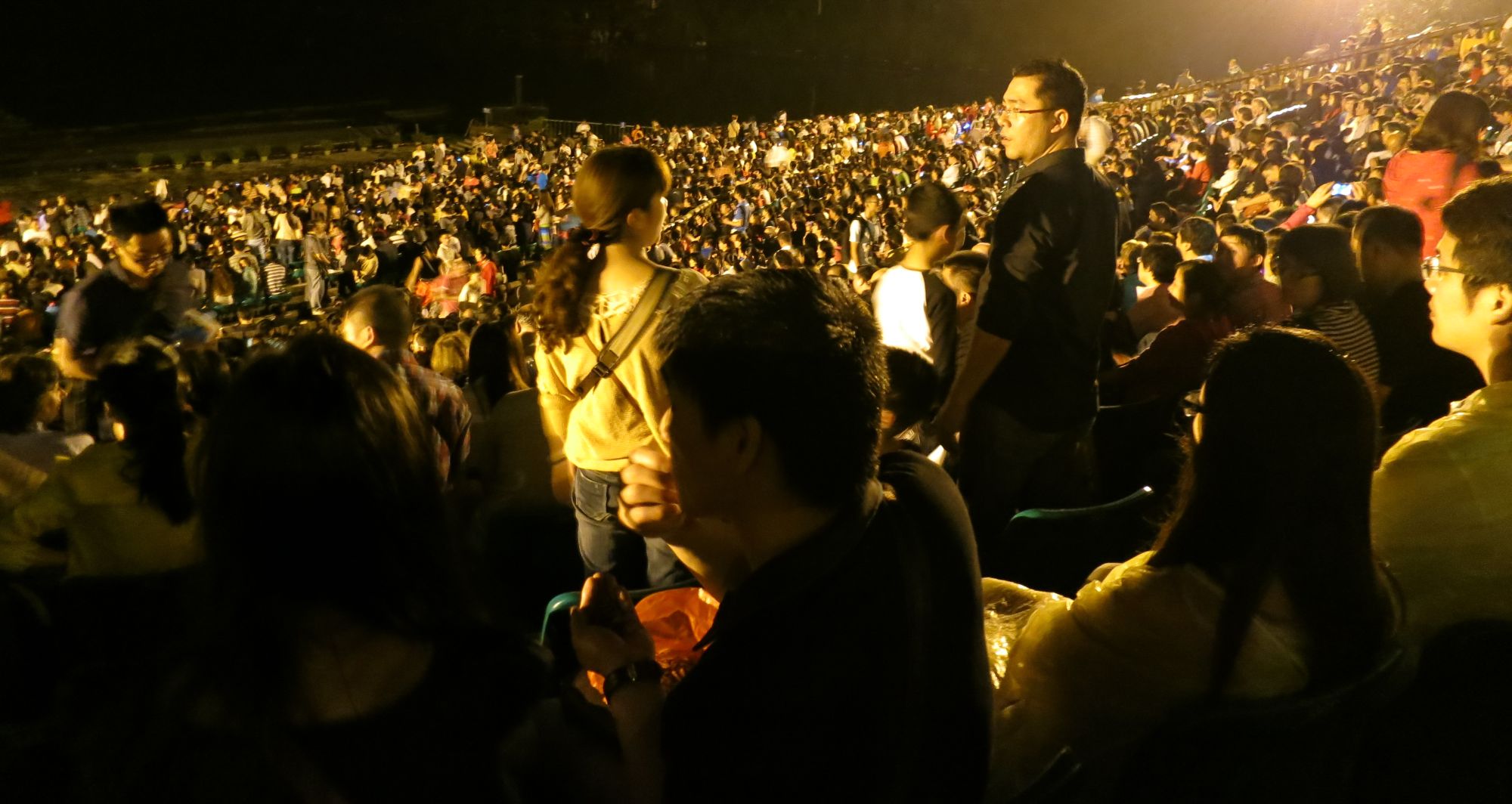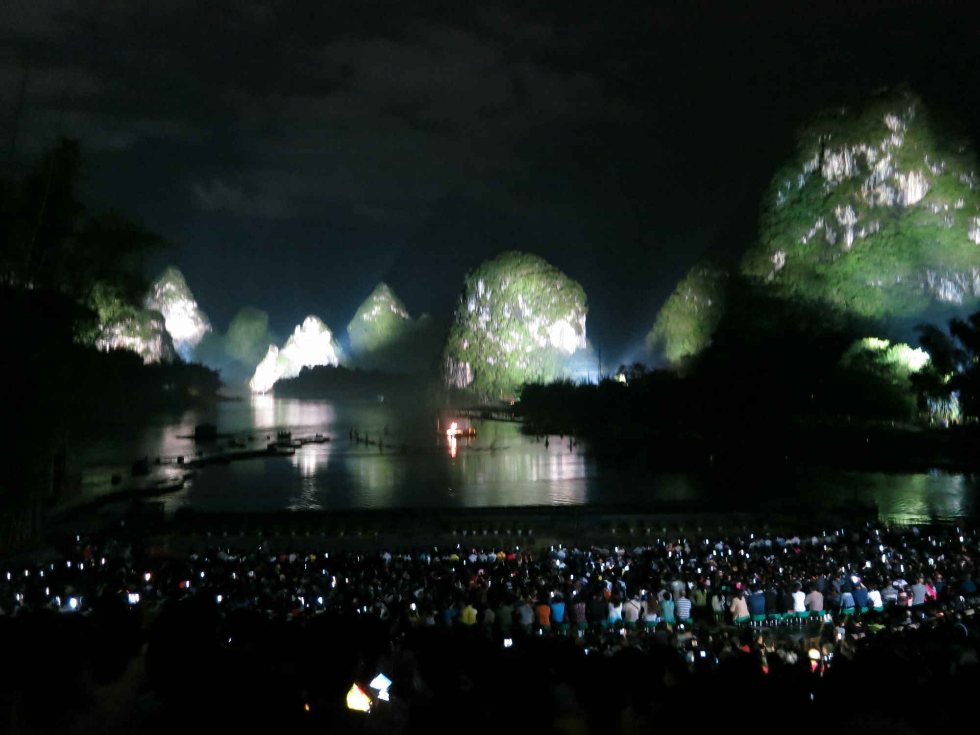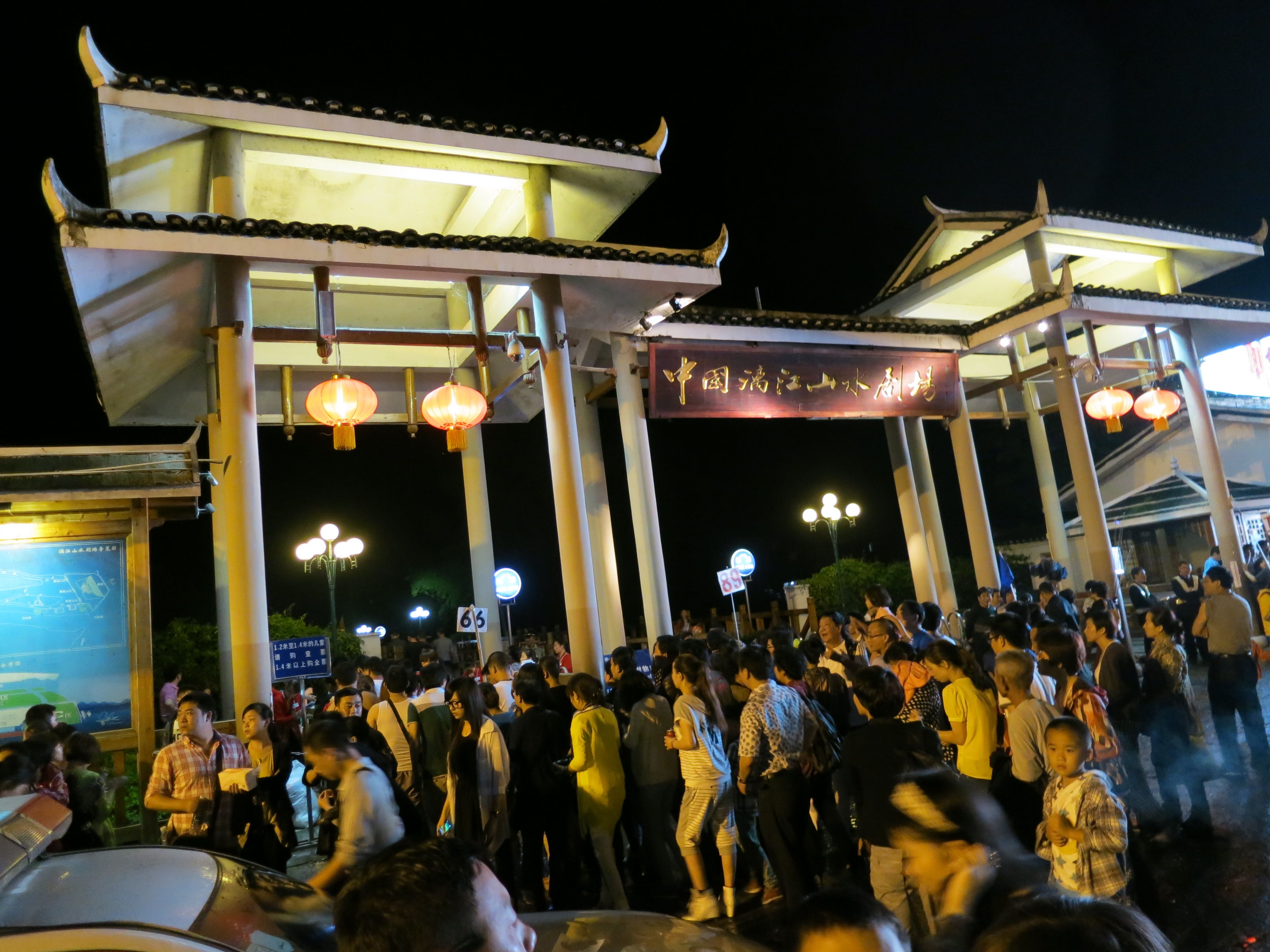 Sen moppe tillbaka till pensionatet, och senare på kvällen en minibuss med plats för 6 när vi var 7 inklusive guiden, till en utomhusteaterföreställning, Impression Liu Sanjie, en traditionell historia med regisserad av samma person som regisserade filmen ”Hero” . Oturligt nog var vår guide mer biljettköpare än just guide, så vad showen handlade om var lite svårt att förstå för oss som inte var pålästa innan. Men det var maffigt med riktigt vatten och berg som kulisser.