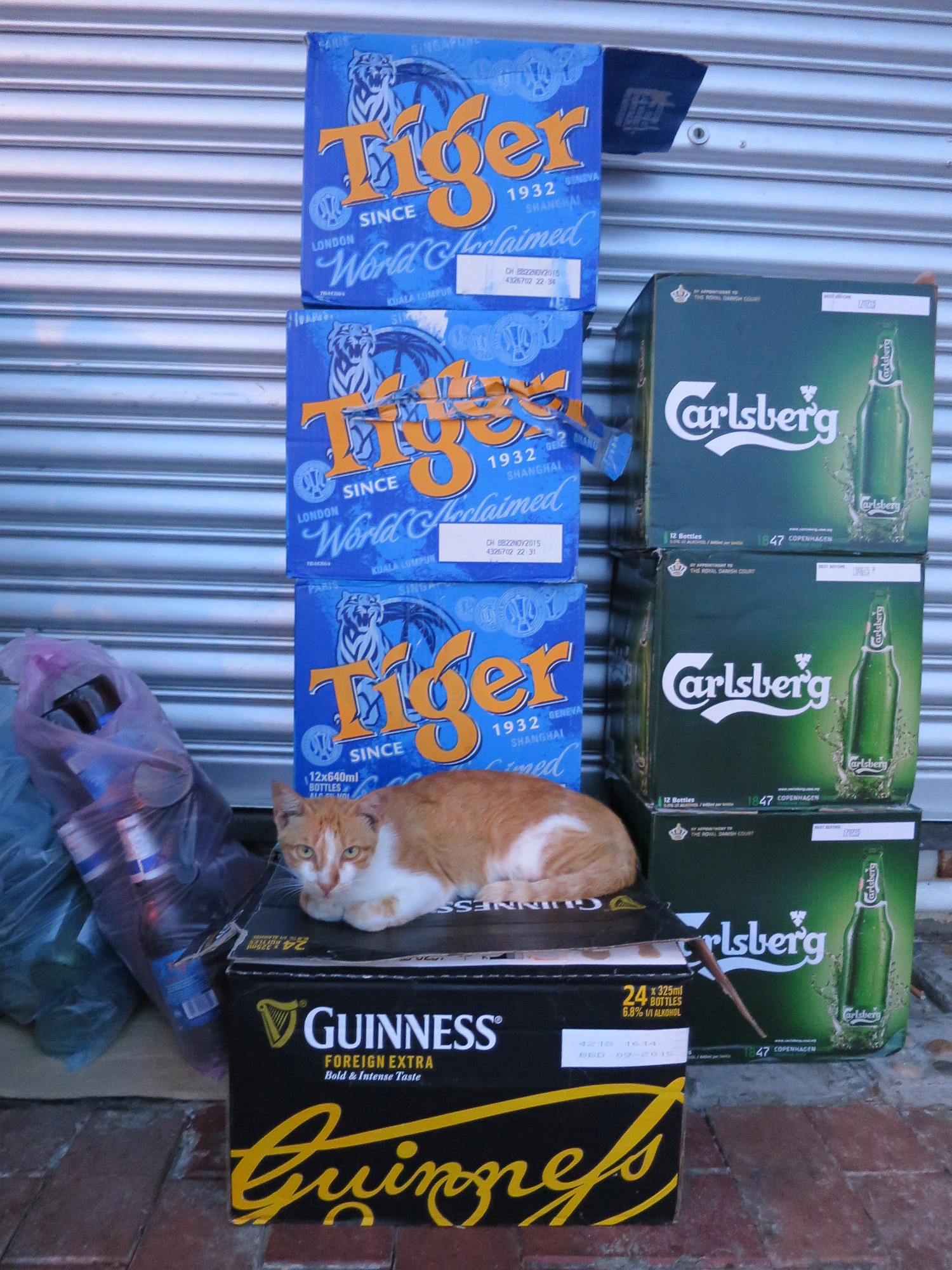Inte kattvakt, utan vakt-katt! Den mest tiger-lika fick detta öl-låde-bevakningsuppdrag.