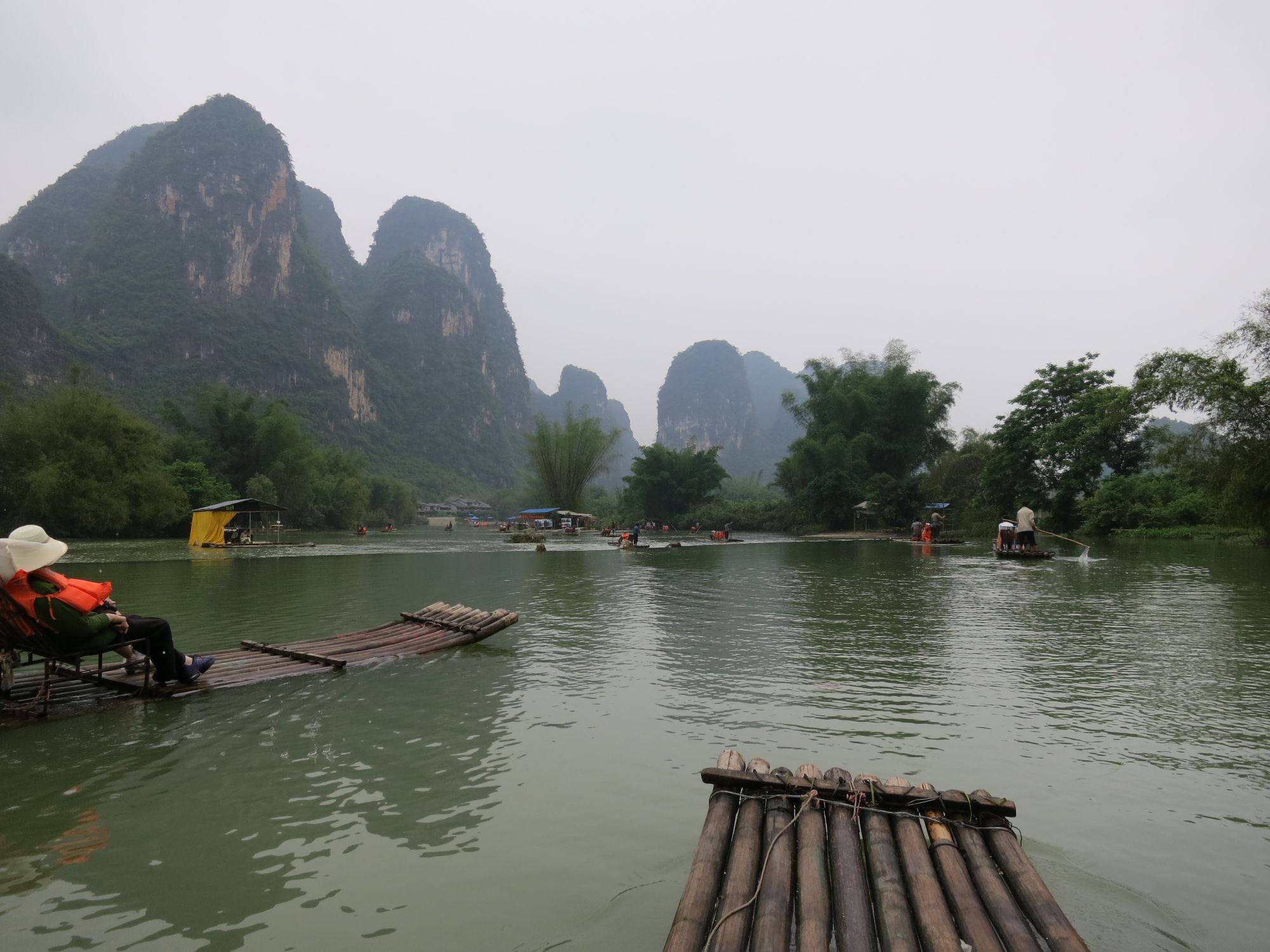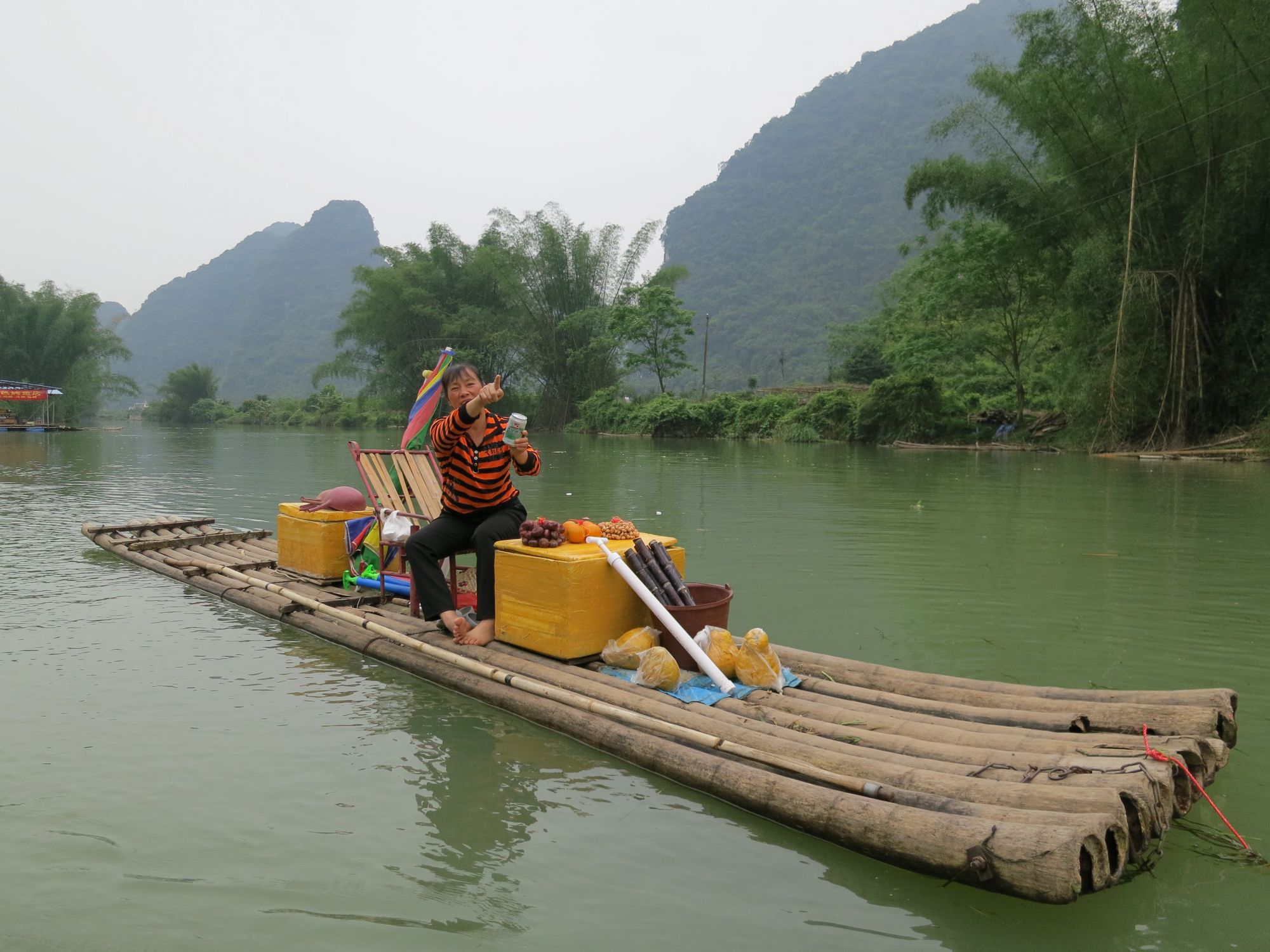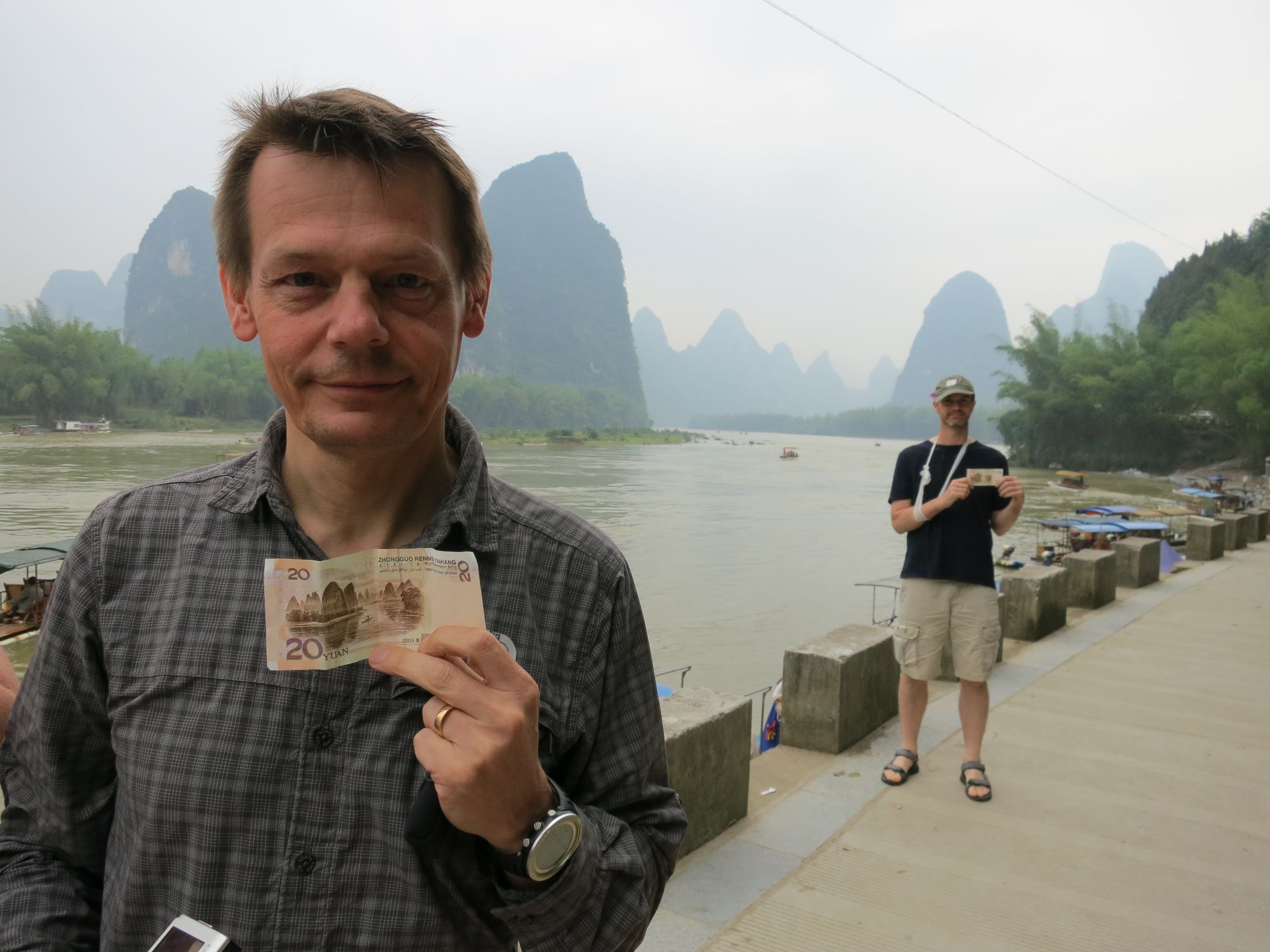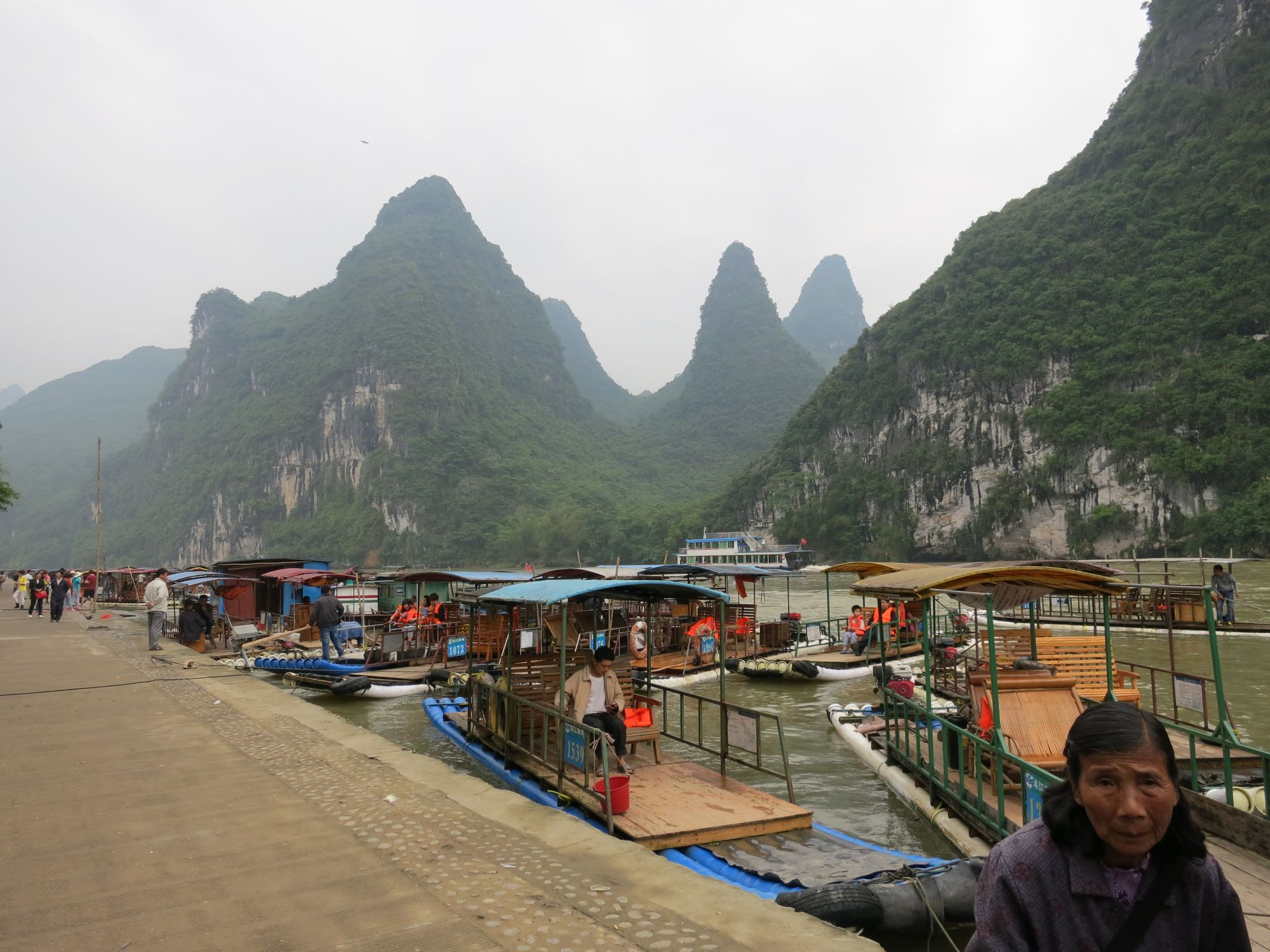 Jahapp, men inte hade vi flottat färdigt för denna dagen. Guiden hade även köpt biljetter till en plastbambumotorflott-färd på floden Li. Det speciella med denna färd är att man åker längs massor av berg såklart, och många med namn efter vad någon tycker att de liknar, och slutligen kommer man fram till platsen som är motivet på baksidan av den kinesiska tjugan, Xingping. En liten stad med ett stort ”gamla stan”-kvarter med hantverk, lokala specialiteter, och vanligt krimskrams förstås.
