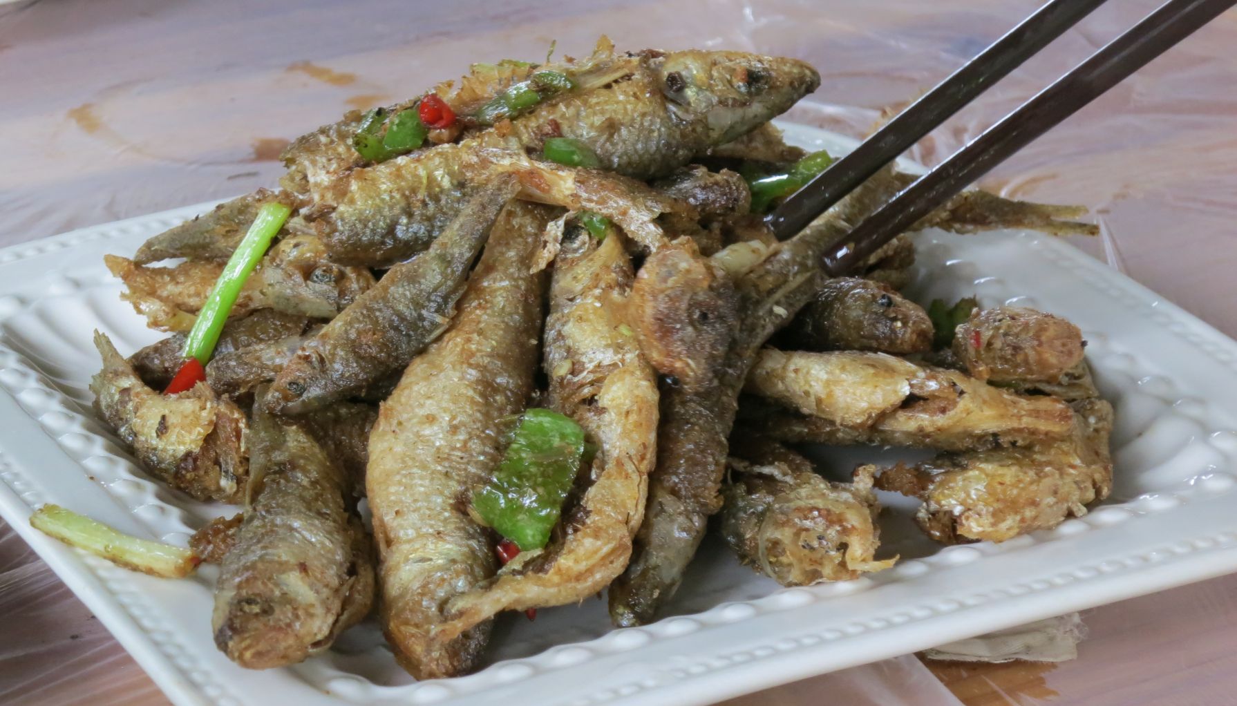 Kina-mat till lunch, vilken överraskning? Jag fegade på fisk som enligt FreLi får en mört att verka benfri. Men en slurk öl med en gris på baksidan av etiketten var OK!