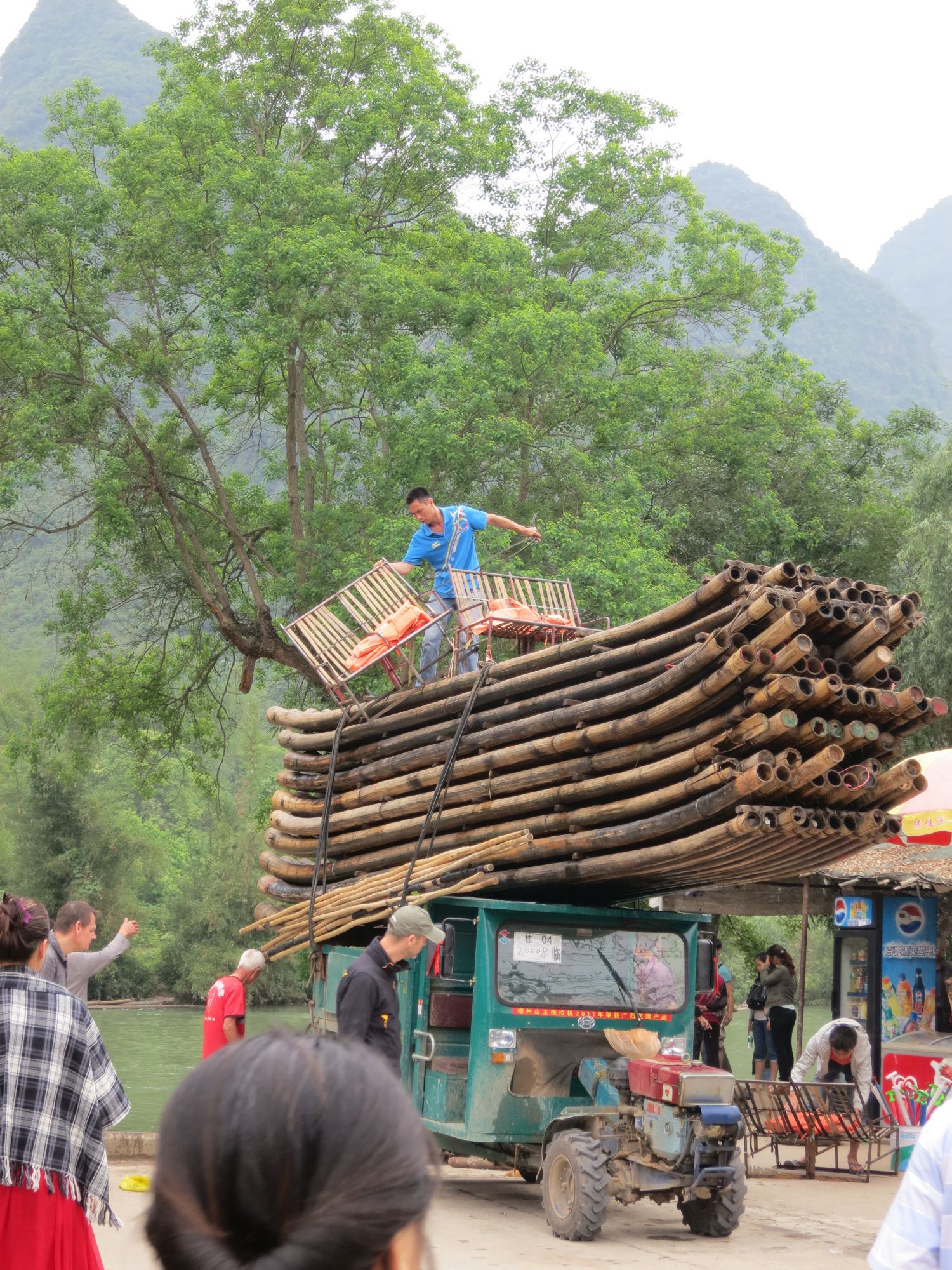 Bambuflottar, som åker medströms på floden och uppströms på lastbil. Utrustade med en tvåsitssoffa. Framdrivna av strömmen och en gondoljär med bambustav.