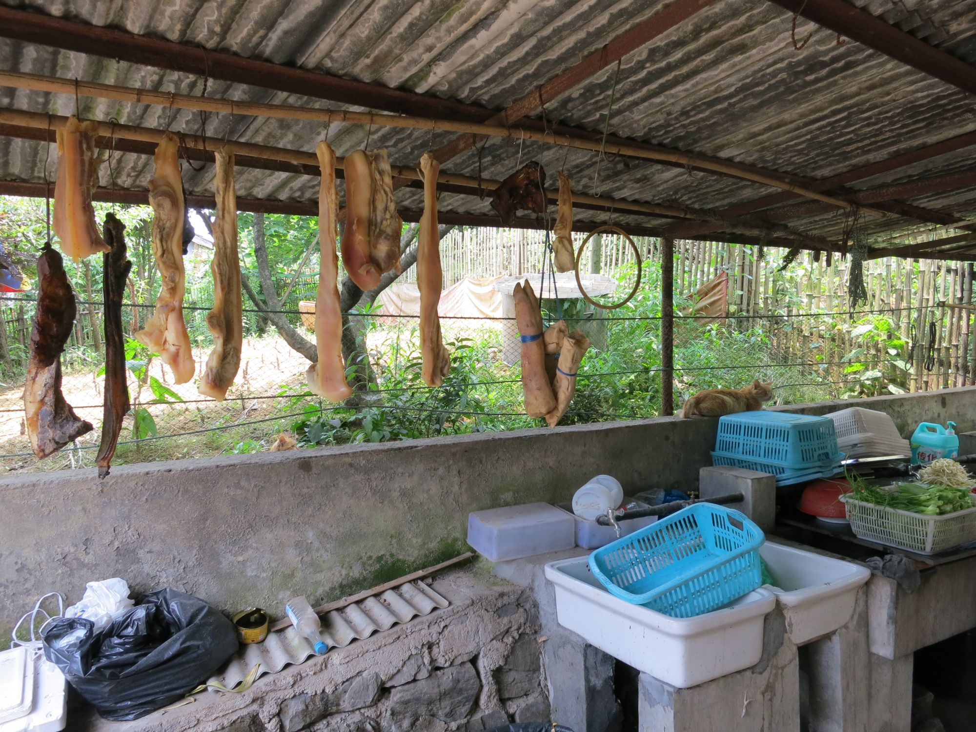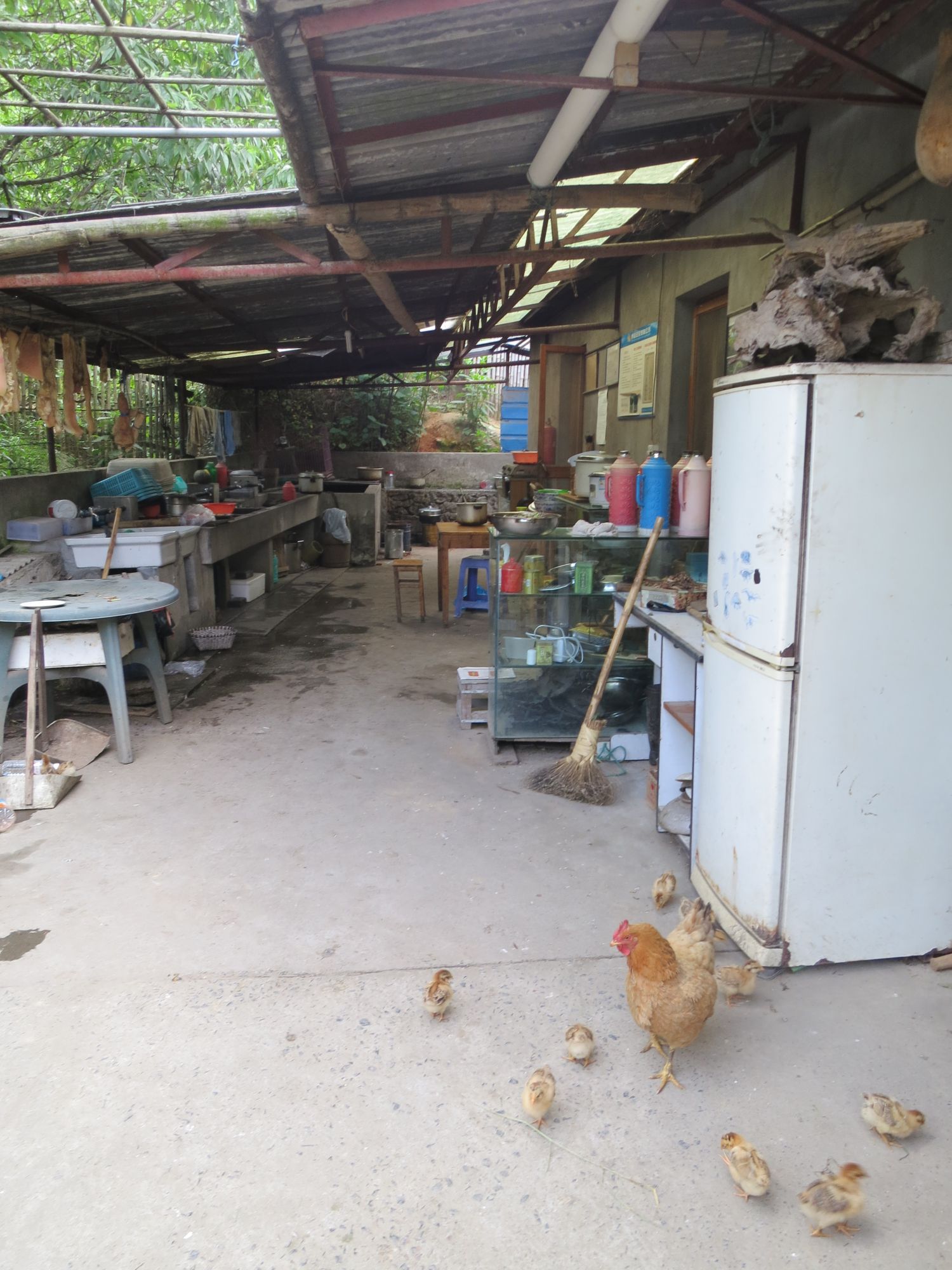 Maten smakade bra, även om köket såg ut som man inte borde tänka något som har med bacillskräck att göra. Katt och torkning av kött, köksgolv och kycklingfarm.