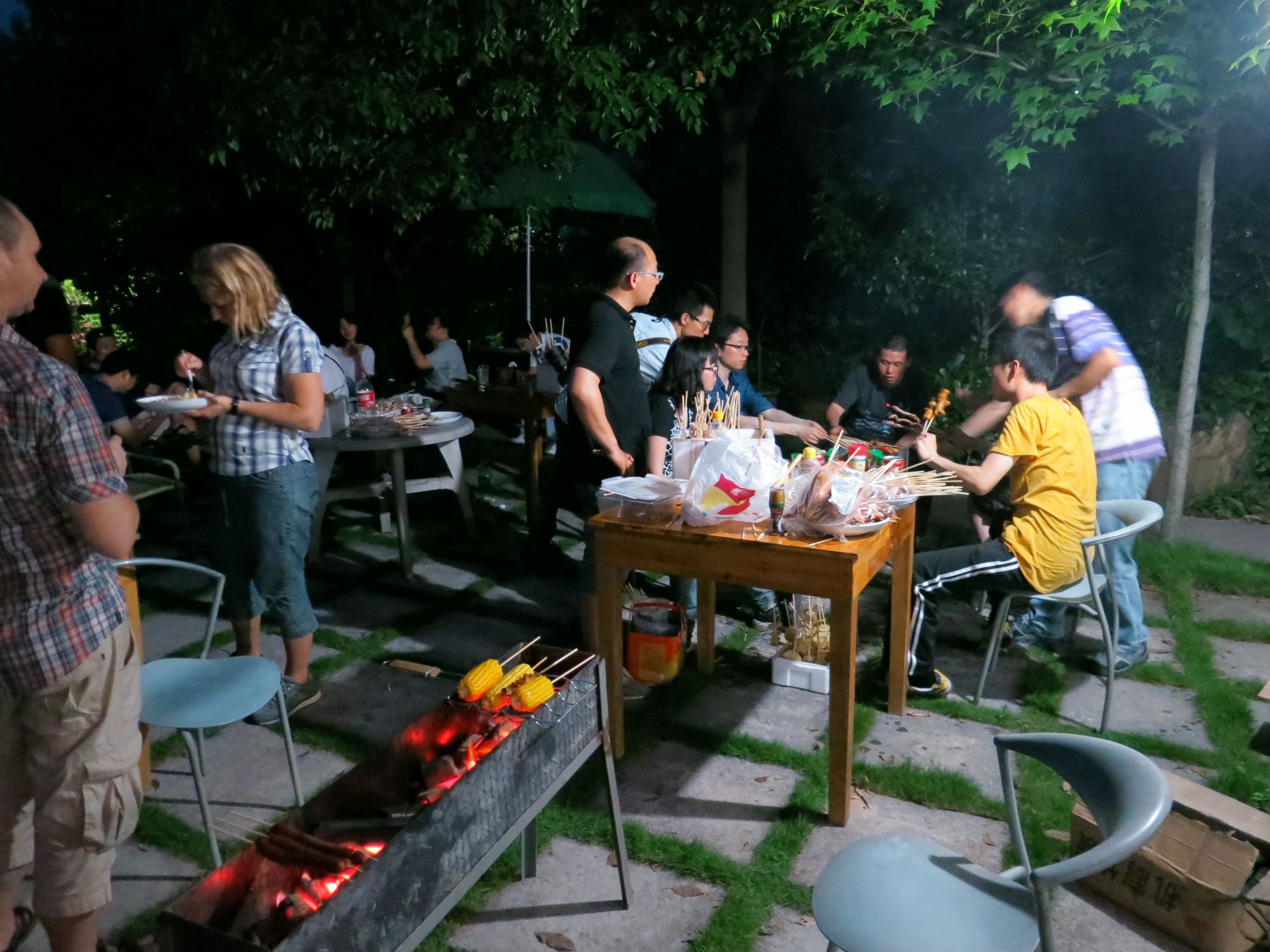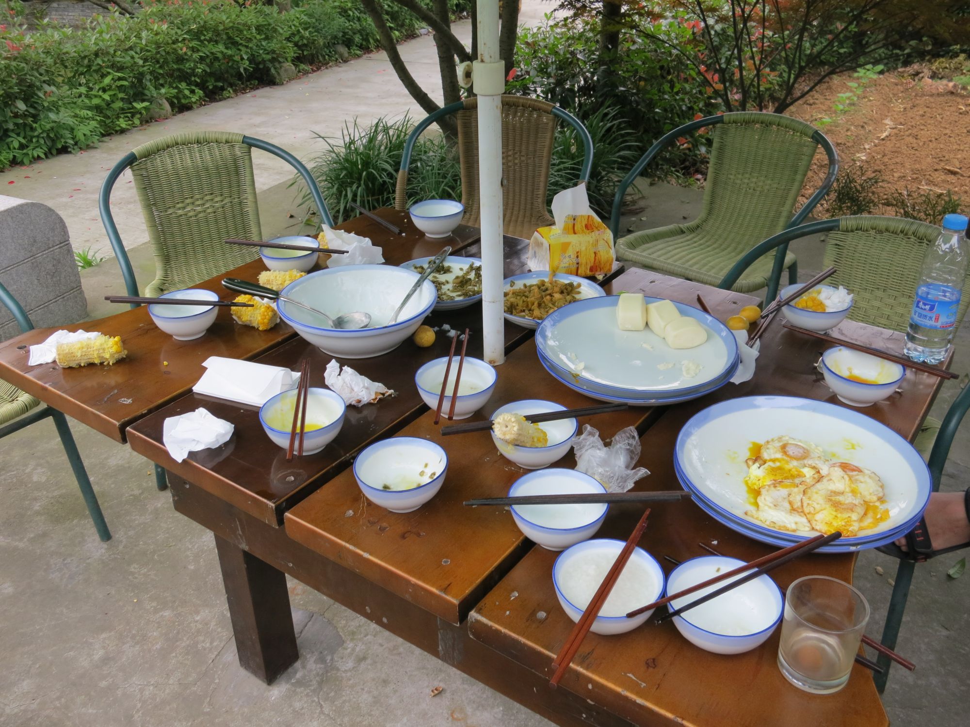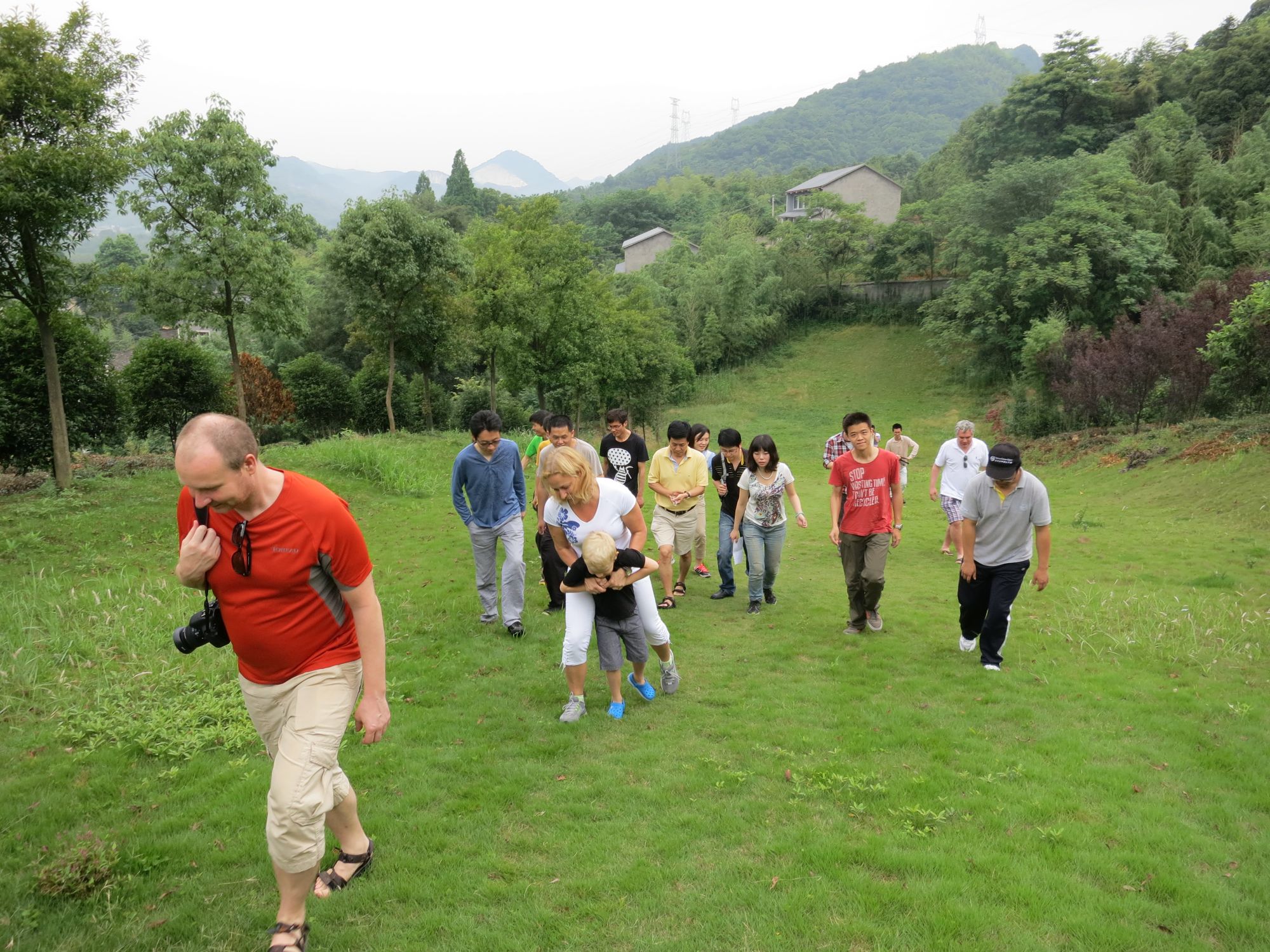 Teambuilding med jobbet, eller avtackning av nuvarande svenne-chefen, man fick i vilket fall ta med sig familj eller vänner om man ville. En av killarna på gruppen har släktingar som har ett pensionat, typisk kinesiskt ställe kanske, en del hus med flerbäddsrum typ vandrarhem och några stugor, och en mängd gemensamma ytor att umgås, prata, spela sällskapsspel, etc. Detta var ute på landsbygden i utkanten av staden Hangzhuo, några timmar med bil från SH. Avfärd tidig lördag, sen lyckades vi i ena svenne-bilen inte helt oväntat vara första bil fram till pensionatet, som inte pratade annat än kinesiska till en början. Men en USA-boende släkting på besök hjälpte till att tolka. Skönt avslappnat ställe, lunch när alla kommit på plats. Verkar vara självförsörjande på ägg, kyckling och gås. Kanske även kanin.