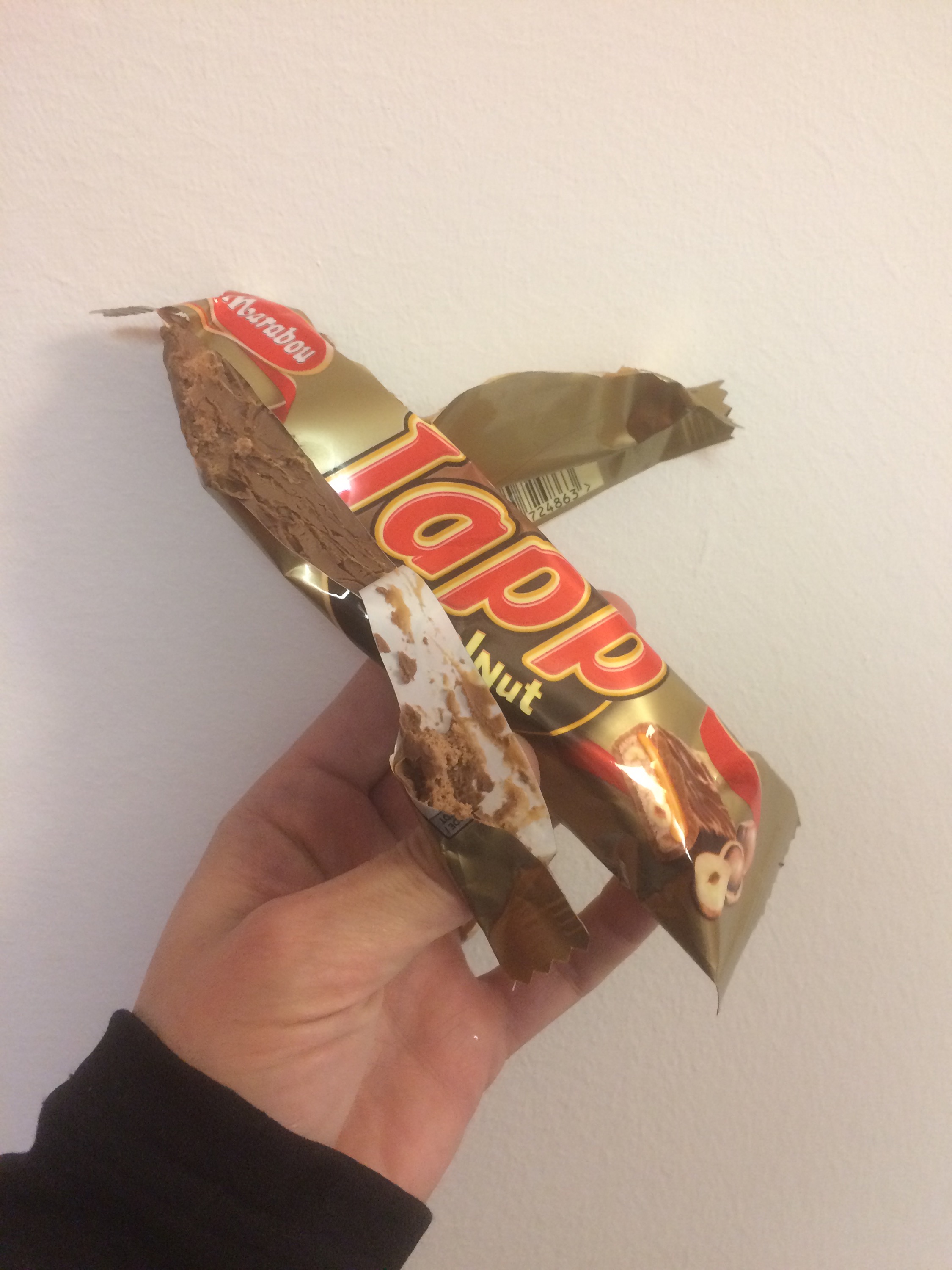 Har hittat en som inte gillar långa hårda kramar… Varken tryck eller värme! Smyg inte med en Japp Hasselnöt i portföljen, om du klämmer upp portföljen mellan din rygg och stolens under ett långt möte! (Gäller troligen alla Jappar. Eller alla Marabou stycksaker. Eller så gott som all choklad, helt enkelt!)