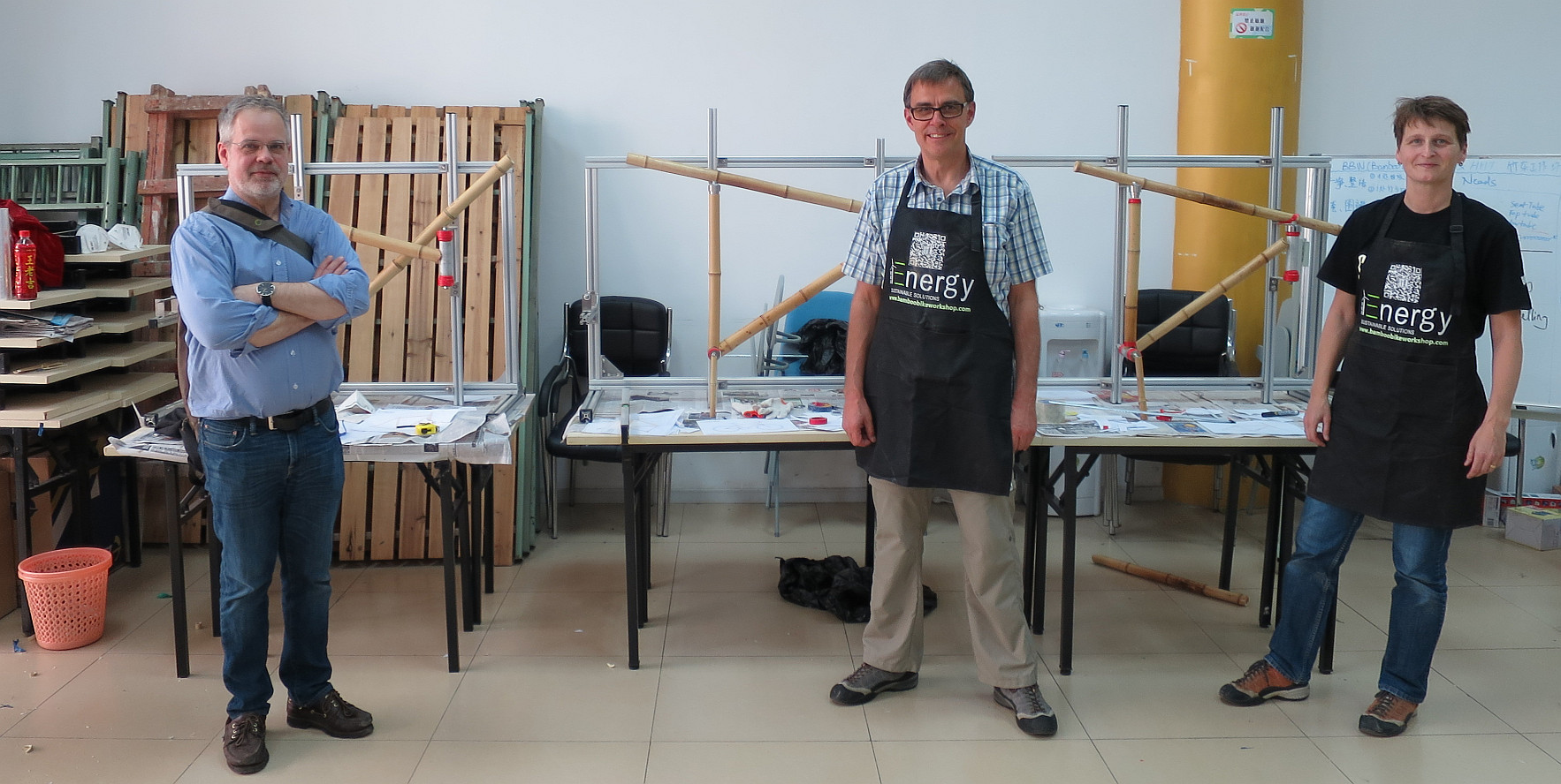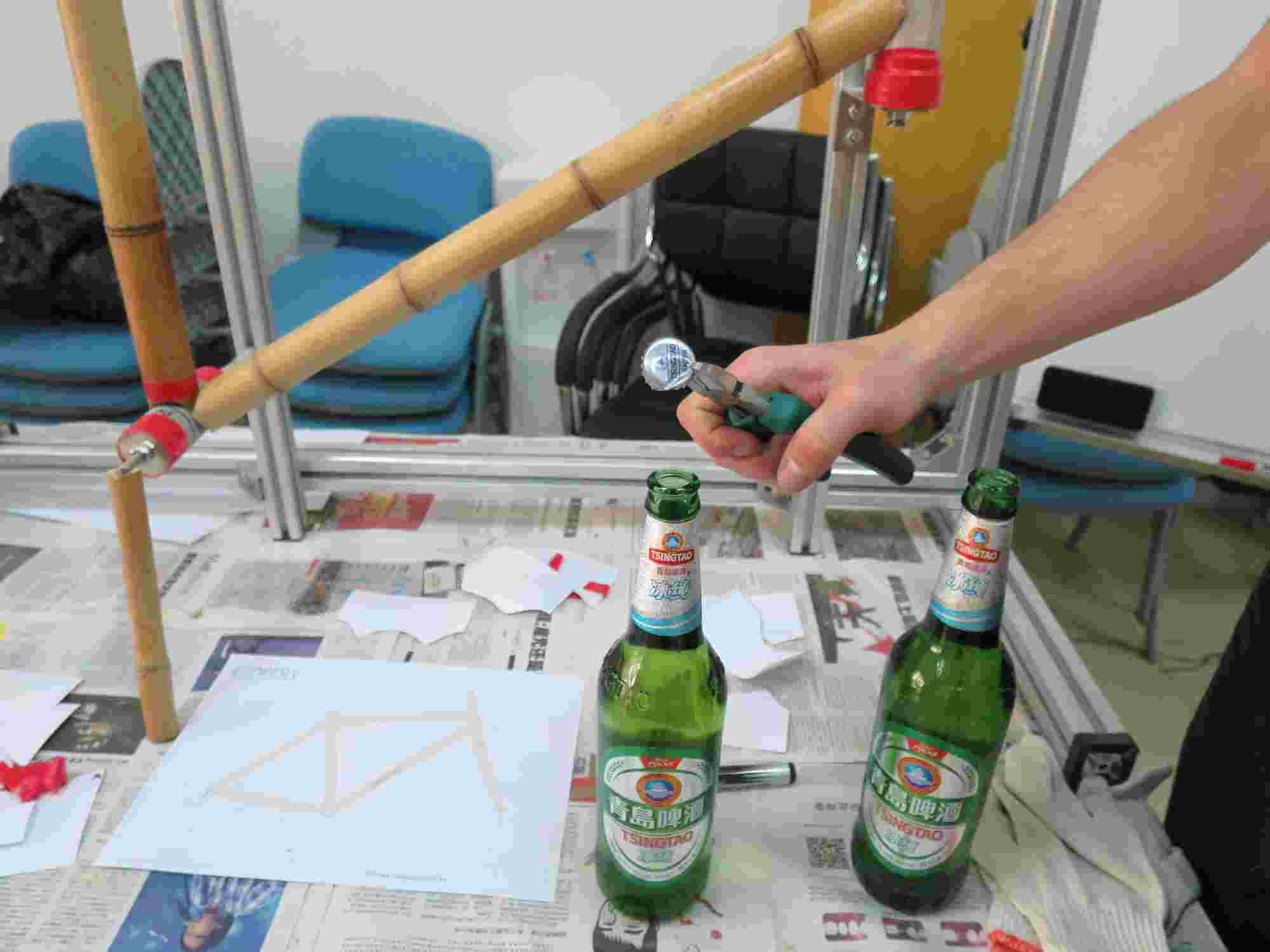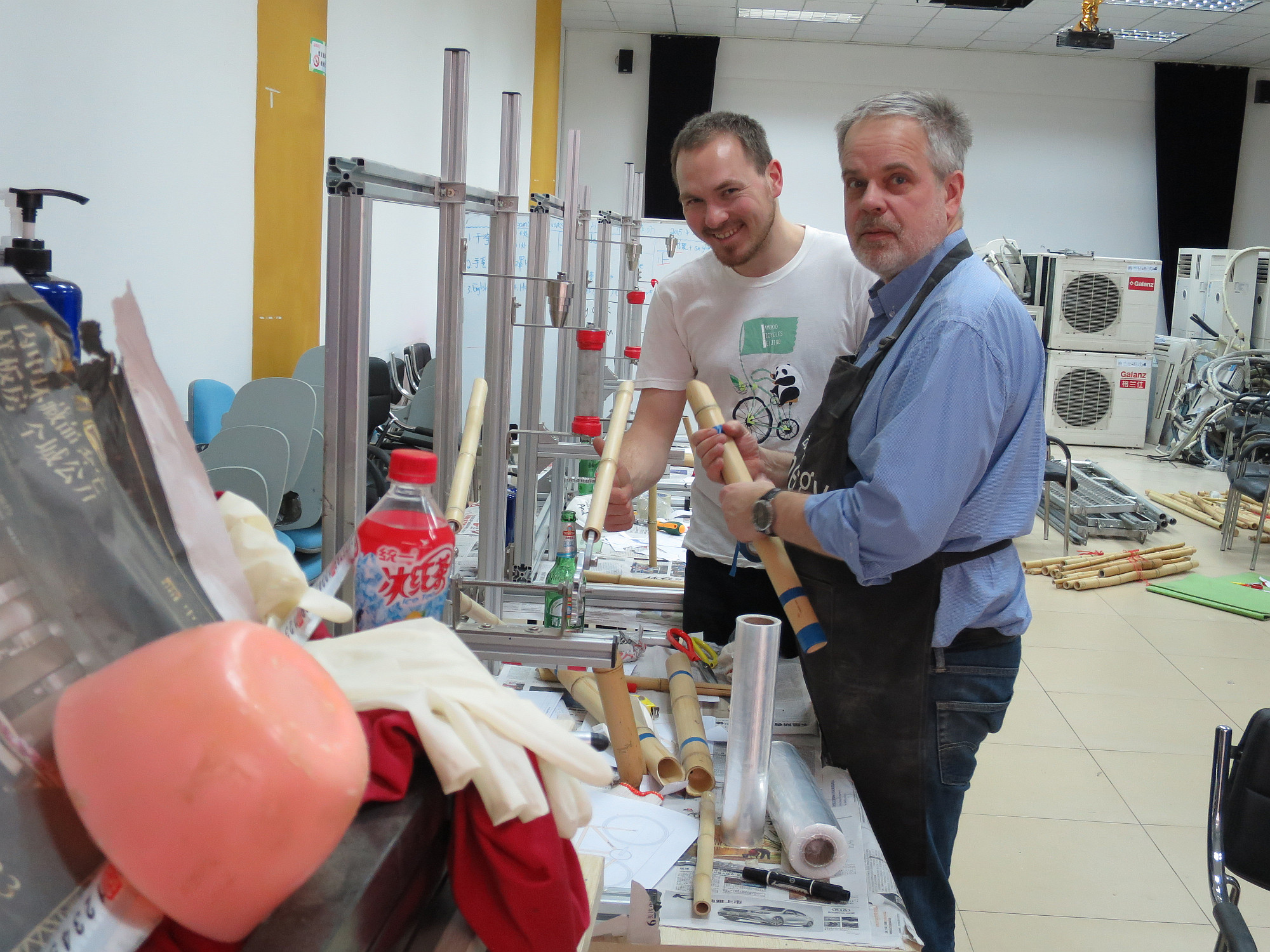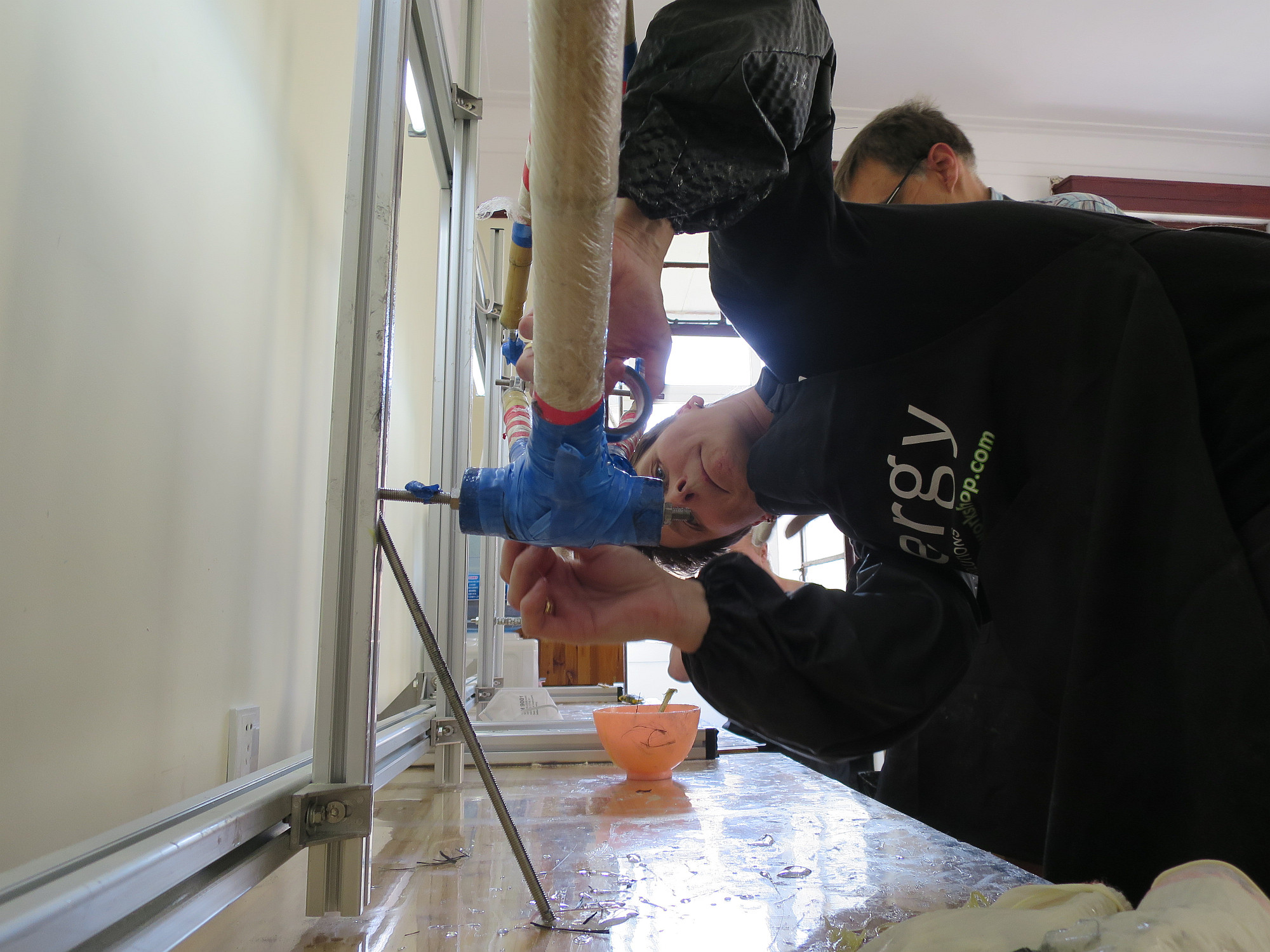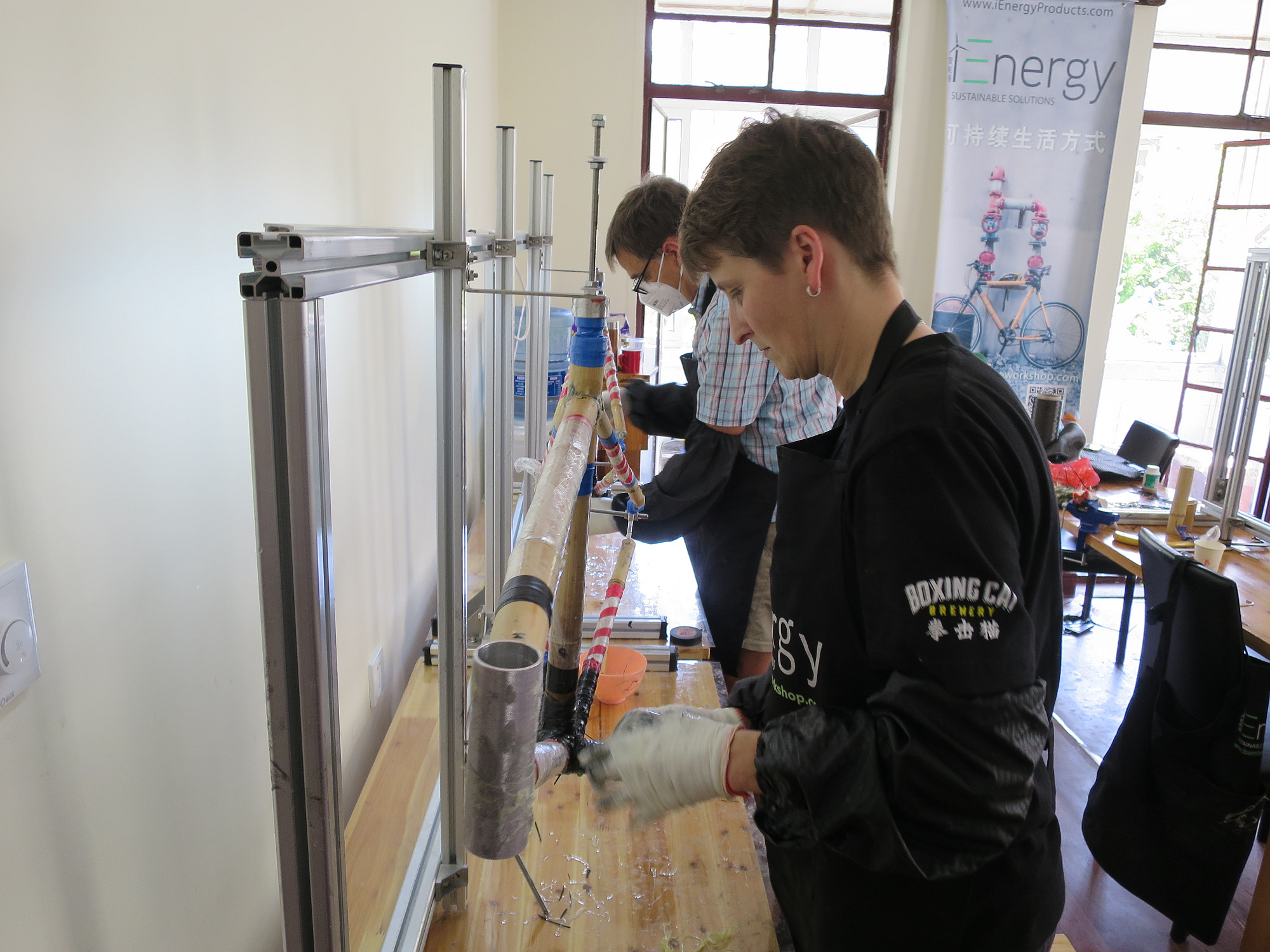 Sigi och Andy med evigt tålamod att fylla på våra epoxybyttor och visa tricksen att linda kolfibret, väl värda varsin kinesisk blasköl, flåt, flasköl. Fast blasköl är nästan mer sant, men riktigt bra törstsläckare en svettig dag som denna.