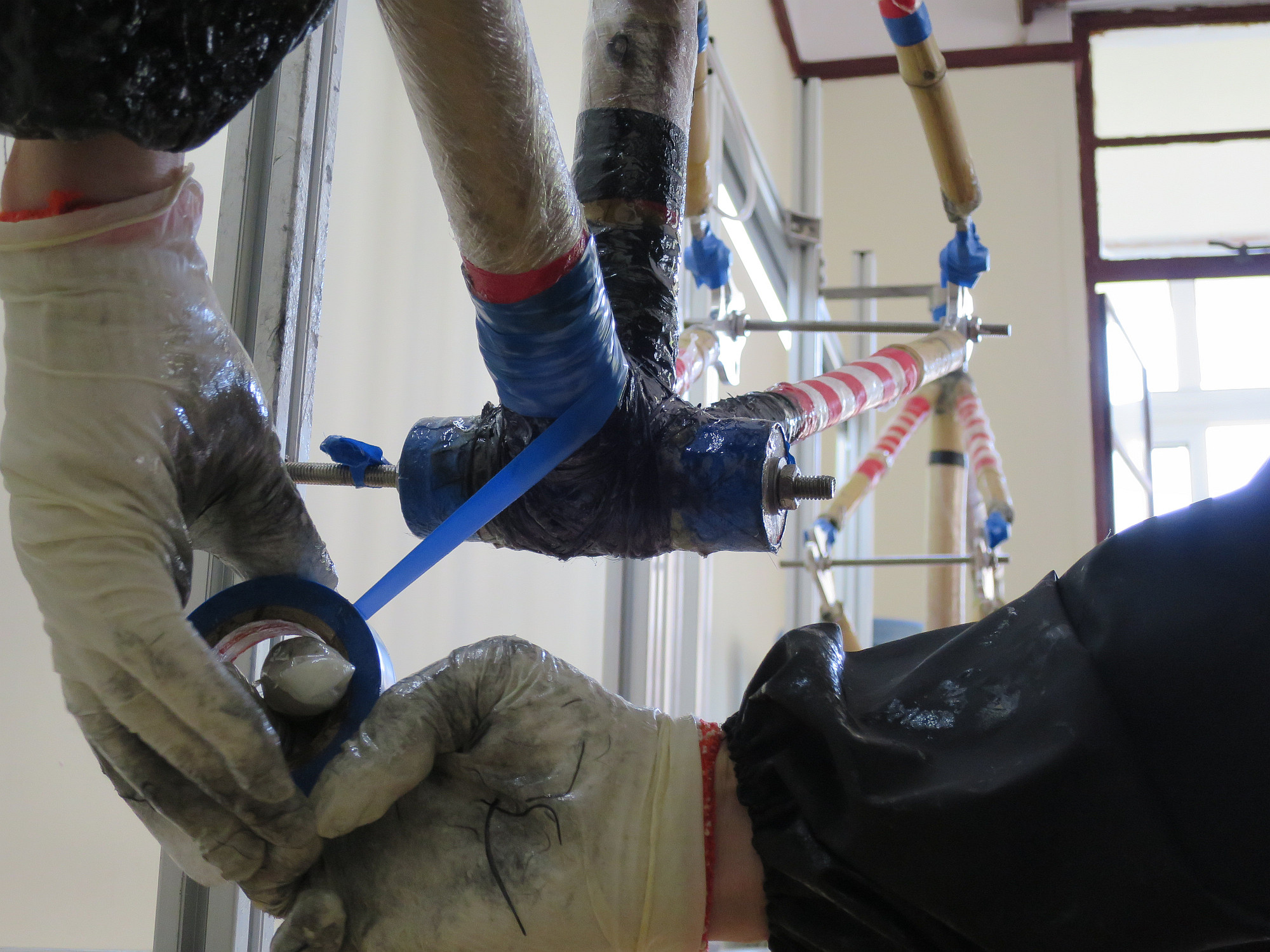 Nästa steg, slå in knuten i tejp, lindad avig, med torra sidan mot. Detta ska ge slutytan på knuten efter härdningen.