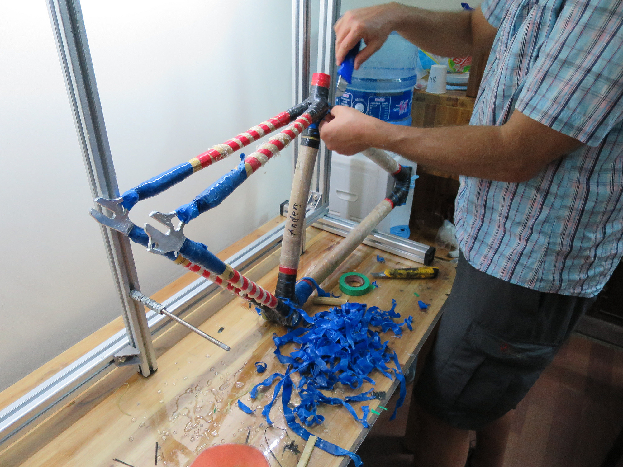 Gummihandskar och lösa ärmar som en landsortsveterinär under förrättning… Slabbadabb och lindning, börjar nere vid vevpartiet, sen knuten mellan topprör och sadelrör, sen styrhuvudet, sist kedje- och sidostagen ner mot infärtningen till baknavet. Linda linda och kleta kleta.