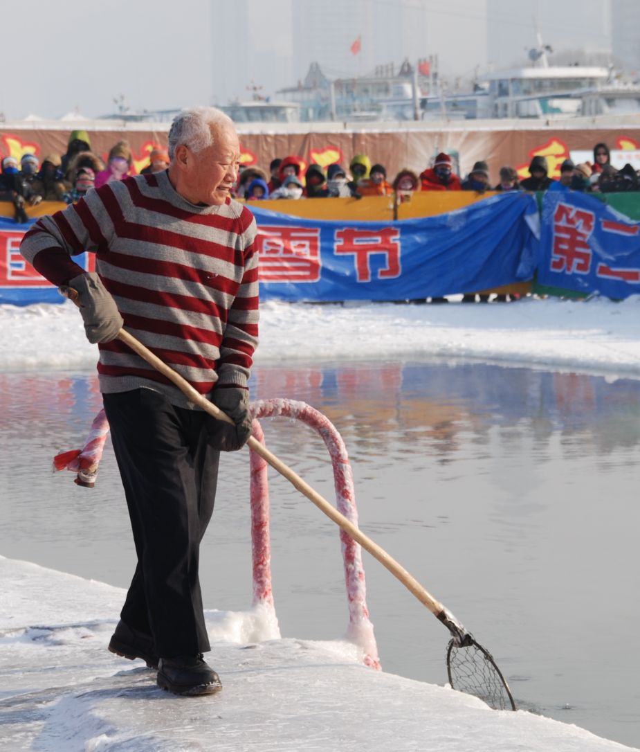 Vinterbadsuppvisning, en massa kineser och ryssar i sina bästa år, i foppatofflor, gummiskor, diskhandskar och badmössor. Först lite avisning av poolen bara, och lite uppvärmningsgympa:
