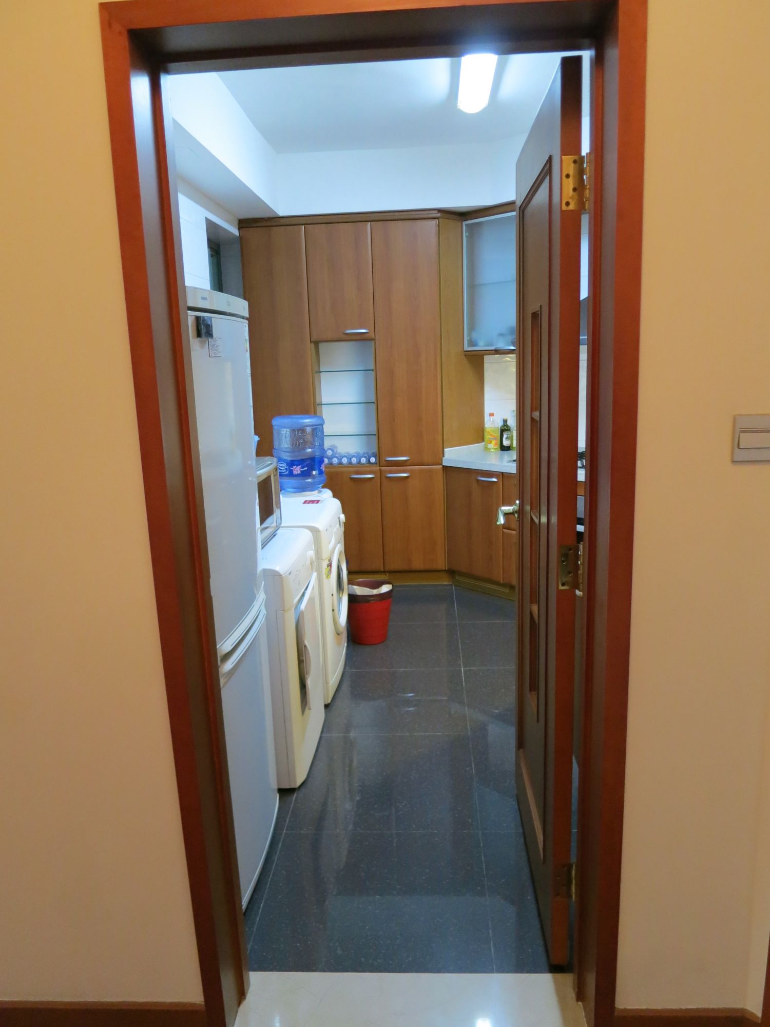 Vi tittar in i köket. Kyl, frys, tvättmaskin och torktumlare. Faktiskt även en ugn, vilket inte är kinesisk standard. Gasspis. Dricksvatten i ”bubbla”.
