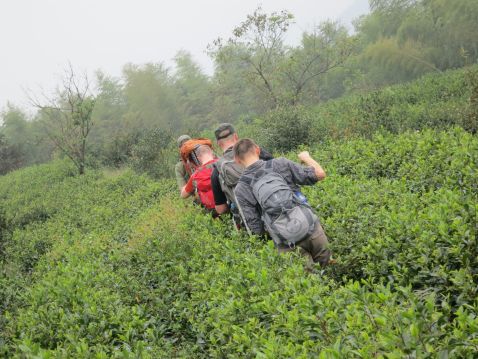 Jaja, men idag var det bra med många sittplatser! Äventyrsresa planerad med 4 killgubbar från jobbet + oss 2, fast en killgubbe föll bort pga lömsk mage. Typ kinamatsmage. (Inga mer detaljer tror jag behövs/önskas.) Ca 20 mil från SH (ca 3 timmars bilfärd) har det platta flod-delta-landskapet bytts mot böljande bambuskogar och teodlingar. Kul! Orten vi åkte till heter Moganshan, FL hade vandrat där förut och hade med hjälp av GPS-log och Google Earth klurat ut en bra vandringsrunda för en dagstur. Kartor är inget som är enkelt att få tag på, särskilt inte för friluftsliv. Det finns nog helt enkelt inte. Riktigt annorlunda att se bambuskog, idag var det lagom varmt men fuktigt, mycket och lummig undervegetation, i början en del myggor också. Första delen var 450 höjdmeter på jag vet inte riktigt vilken sträcka egentligen, men rejält brant var det, och utan stig för vi hade ju en egen plan… Svettigt! Ackompanjerade av syrsor, kände man sig nästan som i nån film från Vietnamkriget. Lite pyssel att hitta starten på den tänkta vandringen, men det var å andra sidan enkelt om man jämför med att hitta till dit vi hade tänkt sluta, och där vår chaufför skulle hämta upp oss… Tipsen vi fick av den hyfsat engelsktalande servitören på en av ”gästhusen” i byn, angående i vilken riktning vi skulle gå för att komma dit vi trodde att vi beskrev, var inte helt pålitliga. Deras engelska är ofta inte så bra, och vår kinesiska är tyvärr ännu sämre. Nåväl! Vi hade turen att bli upp-plockade av en engelsktalande tjej från gästhuset vi åt på, och nerkörda till en annan by i en minibuss. Plus att hon hjälpte oss att ringa vår kinesiske chaufför och ge honom nya order var vi skulle hämtas… Puh! Hade inte hennes minibuss kommit, hade vi nog haft svårt att hinna till jobbet imorgon bitti, eller ens gissa var vi hade hamnat… Hursom, inga sura miner, tyvärr lite disigt för att ha riktigt bra utsikt från höjderna och ner mot dalarna, men verkligen kul att se landskapet och få röra på sig en heldag!