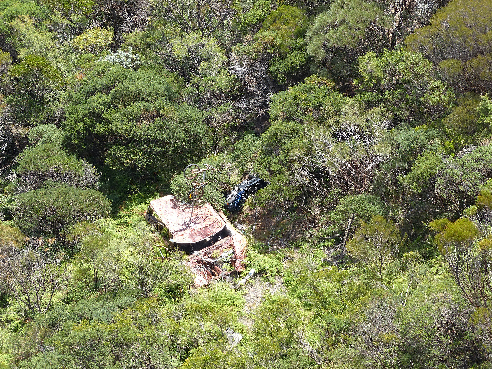 En skrotbil hade provat en just en sån luftfärd, i sällskap med några cyklar.